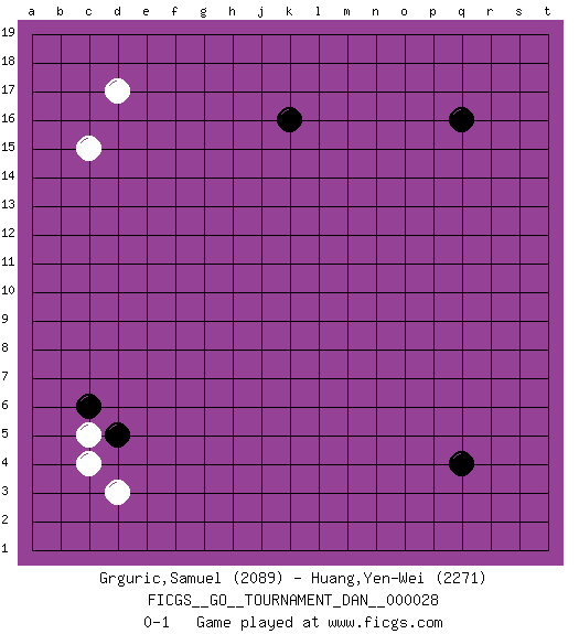 Last move : 0-1 2012 April 9 23:32:21 [Event "FICGS__GO__TOURNAMENT_DAN__000028"] [Site "FICGS"] [Date "2012.02.02"] [Round "1"] [Black "Grguric,Samuel"] [White "Huang,Yen-Wei"] [Result "0-1"] [Rating 1 "2089"] [Rating 2 "2271"] 1.q16 d17 2.q4 d3 3.d5 c5 4.c6 c4 5.k16 c15 0-1 This go game has been lost on time (started : 2012.02.02 11:52:9) Here are the names of the openings (joseki) played in the four corners : Corner d4 : d3 d5 Komoku (Somok, Xiao~mu`) 3-4 Point. The komoku (3-4) point is the traditional corner enclosure move.. Ikken Takagakari (Hankan Nop'dakeolch'im, Yi Gaogua`jiao~, 1-Space High Approach). The 5-4 approach move has become more popular in modern times, as modern Go emphasizes speed and influence. Player White won this Go (weiqi, baduk) game. Follow this game move after move (download)Only amateurs try to come up with fancy moves. (Anonymous) The weakness of an artist is dogma. (Josh Waitzkin)