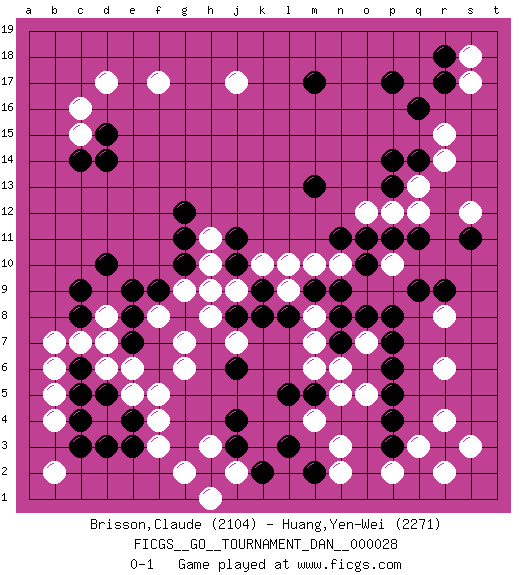 Last move : 0-1 2012 August 10 15:57:17 [Event "FICGS__GO__TOURNAMENT_DAN__000028"] [Site "FICGS"] [Date "2012.02.02"] [Round "1"] [Black "Brisson,Claude"] [White "Huang,Yen-Wei"] [Result "0-1"] [Rating 1 "2104"] [Rating 2 "2271"] 1.q16 d17 2.c3 r4 3.p4 m4 4.p6 r6 5.p8 r8 6.j4 m7 7.r3 s3 8.d15 c15 9.c14 c16 10.d14 f17 11.d10 o7 12.p7 p10 13.q9 n10 14.r9 q3 15.p3 r2 16.q11 d4 17.d3 f4 18.e4 e5 19.e3 g6 20.j6 g9 21.m5 n5 22.l5 o5 23.p5 n3 24.j8 d8 25.c8 c7 26.c9 d6 27.p17 j17 28.m17 r14 29.q14 q13 30.p14 r15 31.p13 s17 32.r17 s18 33.r18 s12 34.s11 q12 35.p11 p12 36.o11 o12 37.n11 m10 38.m13 f3 39.l3 p2 40.m2 n2 41.j10 b4 42.c4 b5 43.c5 b7 44.d5 f5 45.c6 b6 46.f9 f8 47.g8 h8 48.e8 g7 49.e7 d7 50.e9 e6 51.g10 j9 52.k9 h9 53.k8 h10 54.g11 h11 55.g12 j2 56.h2 h3 57.j3 g2 58.k2 b2 59.n8 m8 60.n7 n6 61.o8 m6 62.m9 l9 63.n9 l10 64.l8 k10 65.o10 h1 66.j11 j7 0-1 Here are the names of the openings (joseki) played in the four corners : Corner q4 : r4 p4 Komoku (Somok, Xiao~mu`) 3-4 Point. The komoku (3-4) point is the traditional corner enclosure move.. Ikken Takagakari (Hankan Nop'dakeolch'im, Yi Gaogua`jiao~, 1-Space High Approach). The 5-4 approach move has become more popular in modern times, as modern Go emphasizes speed and influence. Corner d16 : d17 d15 Komoku (Somok, Xiao~mu`) 3-4 Point. The komoku (3-4) point is the traditional corner enclosure move.. Ikken Takagakari (Hankan Nop'dakeolch'im, Yi Gaogua`jiao~, 1-Space High Approach). The 5-4 approach move has become more popular in modern times, as modern Go emphasizes speed and influence. Player White won this Go (weiqi, baduk) game. Follow this game move after move (download)The monkey jump is worth eight points. (Anonymous) May I never be complete. May I never be content. May I never be perfect. Deliver me, Tyler, from being perfect and complete. (Chuck Palahniuk, Fight Club)