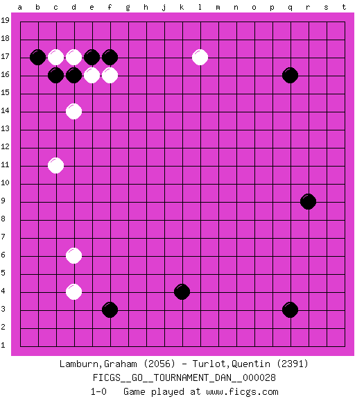 Last move : 1-0 2012 April 28 0:15:54 [Event "FICGS__GO__TOURNAMENT_DAN__000028"] [Site "FICGS"] [Date "2012.02.02"] [Round "1"] [Black "Lamburn,Graham"] [White "Turlot,Quentin"] [Result "1-0"] [Rating 1 "2056"] [Rating 2 "2391"] 1.q16 d4 2.q3 e16 3.r9 c11 4.f3 d6 5.k4 l17 6.c16 d14 7.e17 d17 8.d16 c17 9.f17 f16 10.b17 1-0 Here are the names of the openings (joseki) played in the four corners : Corner d4 : d4 f3 Hoshi (Hwajeom, Seongjeom, Xingwei`) 4-4 Point. The star or hoshi (4-4) point, emphasizing influence at the potential expense of territory. Ikken Kakari (Hankan Keolch'im, Yi Gua`jiao~, 1-Space Low Approach). Black 2 is the standard approach move to the 4-4. Corner q16 : q16 l17 Hoshi (Hwajeom, Seongjeom, Xingwei`) 4-4 Point. The star or hoshi (4-4) point, emphasizing influence at the potential expense of territory. Player Black won this Go (weiqi, baduk) game. Follow this game move after move (download)In an unreasonable situation, an unreasonable move is reasonable. (Tamino) All the troubles of the world come from being unable to sit alone in a quiet room. (Blaise Pascal)