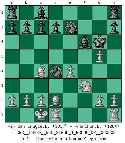 Last move : 0-1 2007 April 10 16:40:40 [Event "FICGS__CHESS__WCH_STAGE_1_GROUP_02__000002"] [Site "FICGS"] [Date "2007.01.16"] [Round "1"] [White "Van den Cruyce,Els"] [Black "Vrenchur,Lojze"] [Result "0-1"] [WhiteElo "1937"] [BlackElo "1284"] 1.f4 g5 2.fxg5 e5 3.d4 exd4 4.Qxd4 f6 5.Nc3 Nc6 6.Qe4+ Qe7 7.Qxe7+ Bxe7 8.Nd5 Bd6 9.Bd2 Nge7 10.Nxf6+ Kf7 11.e4 Nd4 12.O-O-O Be5 13.Bc4+ Kg6 14.Nf3 Bxf6 0-1 This chess game has been lost on time (started : 2007.01.16 15:12:15) Bird : Hobbs gambit Queenside Castling by player White (move 12) Player Black won this chess game. Follow this game move after move (download)Every Pawn is a potential Queen. (James Mason) Nur ein wirklich starker Spieler weiß wie schwach er spielt. (Savielly Grigorievitsch Tartakower) Con el fin de mejorar tu juego, debes de estudiar los finales antes que todo, ya que mientras que los finales pueden ser estudiados y dominados por sí mismos, el juegomedio y la apertura deben de ser estudiados en relación con los finales. (José Raúl Capablanca) Les Echecs sont et restent toujours un combat, un combat intégral comme la boxe, la lutte ou un autre sport, et où il doit y avoir un vainqueur et un vaincu. (Joseph Emil Diemer) Do not put your faith in what statistics say until you have carefully considered what they do not say. (William W. Watt)