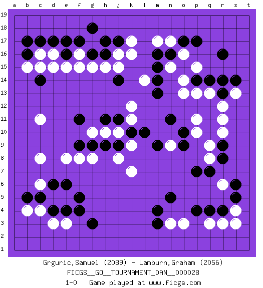 Last move : 1-0 2012 February 20 15:58:16 [Event "FICGS__GO__TOURNAMENT_DAN__000028"] [Site "FICGS"] [Date "2012.02.02"] [Round "1"] [Black "Grguric,Samuel"] [White "Lamburn,Graham"] [Result "1-0"] [Rating 1 "2089"] [Rating 2 "2056"] 1.r16 d16 2.q4 d3 3.p17 r11 4.c5 c8 5.g3 d5 6.d6 c6 7.d4 e5 8.e4 c4 9.b5 e3 10.f4 b4 11.e6 c11 12.f5 r6 13.r8 r3 14.r4 q3 15.p4 s4 16.s5 s3 17.s6 o3 18.r13 p11 19.n5 n3 20.f17 j16 21.c14 f16 22.c17 c16 23.d17 g17 24.e16 e15 25.e17 d15 26.b16 b15 27.b17 c15 28.g16 f15 29.h17 g15 30.h16 h15 31.j17 k16 32.j14 k17 33.g18 n17 34.n11 q8 35.r9 q9 36.q7 r10 37.p7 q13 38.q14 p13 39.p14 s13 40.s14 r12 41.r14 o13 42.m4 n9 43.m16 m17 44.m14 o14 45.m9 e8 46.o15 n15 47.n16 o16 48.m15 p15 49.o17 l14 50.m13 j15 51.o10 p10 52.o9 g8 53.h11 j8 54.f9 f8 55.m3 k11 56.k10 j10 57.j11 k12 58.j9 h10 59.h9 g10 60.g9 k9 61.l10 k7 62.f11 1-0 Here are the names of the openings (joseki) played in the four corners : Corner d4 : d3 c5 Komoku (Somok, Xiao~mu`) 3-4 Point. The komoku (3-4) point is the traditional corner enclosure move.. Ikken Kakari (Hankan Keolch'im, Yi Gua`jiao~, 1-Space Low Pincer). The small knight move is the basic approach move to the 3-4 point stone. It has been continually used for over four centuries. There are limitless variations, with new moves constantly being discovered. Black 2 opens the door to a treaure store of joseki. Corner q4 : q4 r6 Hoshi (Hwajeom, Seongjeom, Xingwei`) 4-4 Point. The star or hoshi (4-4) point, emphasizing influence at the potential expense of territory. Ikken Kakari (Hankan Keolch'im, Yi Gua`jiao~, 1-Space Low Approach). White 2 is the standard approach move to the 4-4. Player Black won this Go (weiqi, baduk) game. Follow this game move after move (download)Learn the eye-stealing tesuji. (Anonymous) I find your interest interesting. (Gregory House, House M.D.)