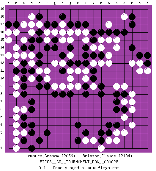 Last move : 0-1 2012 March 13 10:22:48 [Event "FICGS__GO__TOURNAMENT_DAN__000028"] [Site "FICGS"] [Date "2012.02.02"] [Round "1"] [Black "Lamburn,Graham"] [White "Brisson,Claude"] [Result "0-1"] [Rating 1 "2056"] [Rating 2 "2104"] 1.q16 r4 2.d4 c17 3.p4 p3 4.o3 q3 5.o4 r6 6.k4 c6 7.f3 b4 8.c8 c3 9.c5 b5 10.d6 b6 11.d7 o17 12.r14 k16 13.d14 f16 14.d11 q18 15.r17 r12 16.r18 q9 17.h16 h17 18.j17 j16 19.g17 g16 20.h18 h15 21.f17 e17 22.k17 l16 23.p7 q7 24.p8 p9 25.n8 d10 26.e10 e11 27.c11 f10 28.e9 f11 29.f9 g9 30.g8 h9 31.h8 j9 32.j8 k9 33.l8 b14 34.m10 d12 35.c12 c13 36.l12 m9 37.l9 l10 38.k10 l11 39.m11 k11 40.k12 j11 41.e12 d13 42.j12 h12 43.n9 m12 44.h13 g12 45.m13 n12 46.l14 o13 47.o14 n14 48.n13 m14 49.l13 o12 50.m15 n15 51.n16 o15 52.o16 p15 53.m16 l15 54.p16 p14 55.l17 j15 56.s13 s12 57.t12 t11 58.t13 s11 59.e18 d18 60.e16 d17 61.g15 f15 62.g14 j13 63.e15 h17 64.f14 h16 65.q8 r8 66.q6 r7 67.b15 c15 68.b13 b12 69.c14 a13 70.e13 b13 71.c16 b16 72.d15 a15 73.b17 c15 74.h11 j10 75.b15 a16 76.a17 c15 77.j14 d16 78.b11 d2 79.e2 o2 80.n2 p2 81.d3 m2 82.c2 b2 83.d1 b1 84.c4 b3 85.n3 n1 86.l3 l2 87.k2 q5 88.p6 b9 89.c9 b10 90.c10 b8 0-1 Here are the names of the openings (joseki) played in the four corners : Corner q4 : r4 p4 Komoku (Somok, Xiao~mu`) 3-4 Point. The komoku (3-4) point is the traditional corner enclosure move.. Ikken Takagakari (Hankan Nop'dakeolch'im, Yi Gaogua`jiao~, 1-Space High Approach). The 5-4 approach move has become more popular in modern times, as modern Go emphasizes speed and influence. Corner d4 : d4 c6 Hoshi (Hwajeom, Seongjeom, Xingwei`) 4-4 Point. The star or hoshi (4-4) point, emphasizing influence at the potential expense of territory. Ikken Kakari (Hankan Keolch'im, Yi Gua`jiao~, 1-Space Low Approach). White 2 is the standard approach move to the 4-4. Corner q16 : q16 o17 Hoshi (Hwajeom, Seongjeom, Xingwei`) 4-4 Point. The star or hoshi (4-4) point, emphasizing influence at the potential expense of territory. Ikken Kakari (Hankan Keolch'im, Yi Gua`jiao~, 1-Space Low Approach). White 2 is the standard approach move to the 4-4. Corner d16 : c17 d14 San-San (Sam-Sam, San-San) 3-3 Point. The San-San (3-3) point, emphasizing territory at the expense of influence. Niken Takagakari (Dukan Nop'dakeolch'im, E`r Gaogua`jiao~, 2-Space High Approach). White may continue with 4-5 or 4-6. White 4-6 works well when White is in the lower right (so an extension in the middle works both ways). The more conservative 4-5 is makes a slightly tighter shape (better for a fight). Player White won this Go (weiqi, baduk) game. Follow this game move after move (download)It is difficult to know exactly what you are doing. (Pierre Audouard) Luck has a peculiar habit of favoring those who don't depend on it. (Author unknown)