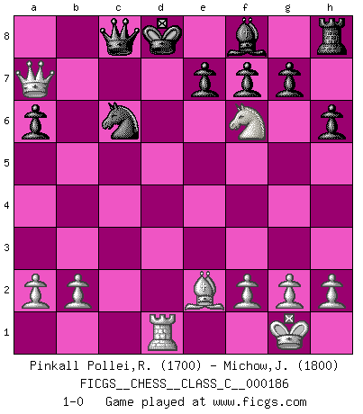 Last move : 1-0 2012 February 28 12:58:56 [Event "FICGS__CHESS__CLASS_C__000186"] [Site "FICGS"] [Date "2012.02.03"] [Round "1"] [White "Pinkall Pollei,Rich"] [Black "Michow,Jordan"] [Result "1-0"] [WhiteElo "1700"] [BlackElo "1800"] 1.e4 c5 2.Nf3 a6 3.c3 Nc6 4.d4 cxd4 5.cxd4 d5 6.exd5 Qxd5 7.Nc3 Qd8 8.d5 Na7 9.Be2 h6 10.O-O Nf6 11.Be3 b5 12.Rc1 Bb7 13.Bxa7 Rxa7 14.Qd4 Ra8 15.Nxb5 Rc8 16.Qa7 Bxd5 17.Ne5 Nd7 18.Rxc8 Qxc8 19.Nc7+ Kd8 20.Nxd5 Nxe5 21.Rd1 Nc6 22.Nf6+ 1-0 Comment by player 1 : Rich Pinkall Pollei : Annotated game available on my website. Sicilian : O'Kelly variation Kingside Castling by player White (move 10) Player White won this chess game. Follow this game move after move (download)Strategy requires thought, tactics require observation. (Max Euwe) Irgendwie scheint mir sonntags früh um 9 Uhr der Killerinstinkt verloren gegangen zu sein. (Alexej Shirov) Un Peón pasado aumenta su poder a medida de que el número de piezas en el tablero disminuye. (Capablanca) Tout change constamment, y compris dans le monde des Echecs. (Botvinnik) Life is the sum of all your choices. (Albert Camus)