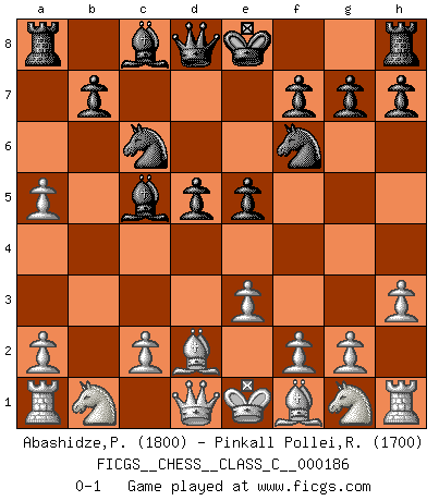 Last move : 0-1 2012 March 19 21:25:33 [Event "FICGS__CHESS__CLASS_C__000186"] [Site "FICGS"] [Date "2012.02.03"] [Round "1"] [White "Abashidze,Paata"] [Black "Pinkall Pollei,Rich"] [Result "0-1"] [WhiteElo "1800"] [BlackElo "1700"] 1.d4 Nf6 2.h3 c5 3.dxc5 e5 4.b4 a5 5.bxa5 Bxc5 6.e3 Nc6 7.Bd2 d5 0-1 This chess game has been lost on time (started : 2012.02.03 6:11:56) Queen's pawn game Player Black won this chess game. Follow this game move after move (download)Weak points or holes in the opponent's position must be occupied by pieces not Pawns. (Siegbert Tarrasch) Ein Schachspiel besteht aus drei Phasen: Die erste, wenn du hofftst den Vorteil zu haben, die zweite, wenn du glaubst einen Vorteil zu haben, und die dritte.... wenn du weißt Du wirst verlieren. (Savielly Grigorievitsch Tartakower) Un jugador que trata de regresar una movida en el Ajedrez es un futuro carterista. (Richard Fenton) On peut tirer plus d'utilité d'une partie perdue que de 100 parties gagnées. (Capablanca) There are 10 types of people in this world: those who understand binary and those who don't. (Anonymous)