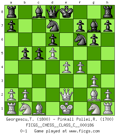 Last move : 0-1 2012 March 19 21:25:33 [Event "FICGS__CHESS__CLASS_C__000186"] [Site "FICGS"] [Date "2012.02.03"] [Round "1"] [White "Georgescu,Traian"] [Black "Pinkall Pollei,Rich"] [Result "0-1"] [WhiteElo "1800"] [BlackElo "1700"] 1.d4 Nf6 2.c4 e6 3.g3 c5 4.d5 exd5 5.cxd5 b5 6.Bg2 d6 7.e4 Nbd7 8.f4 g6 9.Qe2 Bg7 0-1 This chess game has been lost on time (started : 2012.02.03 6:11:56) Catalan Opening Player Black won this chess game. Follow this game move after move (download)Chess is mental torture. (Garry Kasparov) Wer mein Gambit spielt, muß bereit sein, alle Brücken hinter sich abzubrechen. Es verändert den ganzen Menschen. Es wirkt wie ein Zauberstab und fördert verkümmerte, gute Charakter- eigenschaften wieder zu Tage. (Emil Joseph Diemer) El Ajedrez hace al hombre ser mas sabio y ver mas claro. (Vladimir Putin) Des points faibles ou des trous dans la position de l'adversaire doivent être occupés par des pièces et non pas par des pions. (Siegbert Tarrasch) If computers get too powerful, we can organize them into committees. That'll do them in. (Anonymous)