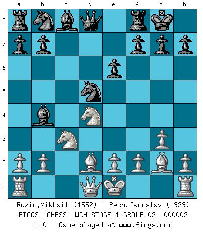 Last move : 1-0 2007 February 14 15:15:45 [Event "FICGS__CHESS__WCH_STAGE_1_GROUP_02__000002"] [Site "FICGS"] [Date "2007.01.16"] [Round "1"] [White "Ruzin,Mikhail"] [Black "Pech,Jaroslav"] [Result "1-0"] [WhiteElo "1552"] [BlackElo "1929"] 1.d4 Nf6 2.c4 e6 3.Nc3 Bb4 4.g3 c5 5.Nf3 O-O 6.Bg2 cxd4 7.Nxd4 d5 8.cxd5 Nxd5 9.Bd2 1-0 Nimzo-Indian : Romanishin-Kasparov (Steiner) system Kingside Castling by player Black (move 5) Player White won this chess game. Follow this game move after move (download)There is no remorse like the remorse of Chess. (H. G. Wells) Es gibt nur zwei wahre Schachgenies - das andere war Wilhelm Steinitz, der Weltmeister von 1872 bis 1894. (Robert James Fischer) Fischer era un maestro de claridad y un Rey del posicionamiento astuto. Sus oponentes podían ver hacia donde se dirigía pero eran impotentes para detenerlo. (Bruce Pandolfini) Les échecs sont un jeu par leur forme, un art par leur essence et une science par sa difficulté d'acquisition. Ils peuvent vous procurer autant de plaisir qu'un bon livre ou une belle musique, mais vous n'aurez une réelle joie que si vous arrivez à bien jouer. (Tigran Petrosian) A married woman is like a fish riding a bicycle. (Rodolfo d'Ettorre)
