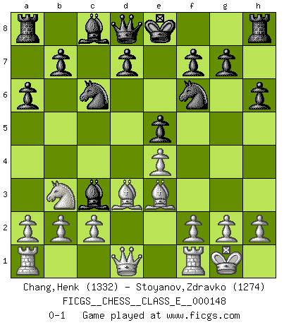Last move : 0-1 2012 March 16 8:53:15 [Event "FICGS__CHESS__CLASS_E__000148"] [Site "FICGS"] [Date "2012.02.03"] [Round "1"] [White "Chang,Henk"] [Black "Stoyanov,Zdravko"] [Result "0-1"] [WhiteElo "1332"] [BlackElo "1274"] 1.e4 c5 2.Nf3 a6 3.d4 cxd4 4.Nxd4 e5 5.Nb3 h6 6.Be3 Nc6 7.Nc3 Bb4 8.Bd3 Nf6 9.O-O Bxc3 0-1 This chess game has been lost on time (started : 2012.02.03 18:52:23) Sicilian : O'Kelly variation Kingside Castling by player White (move 9) Player Black won this chess game. Follow this game move after move (download)Becoming successful at Chess allows you to discover your own personality. That's what I want for the kids I teach. (Saudin Robovic) Die unerbitterlichsten Regeln im Schach sind die Ausnahmen. (Savielly Grigorievitsch Tartakower) Una clavada es mas poderosa que una espada. (Fred Reinfeld) Botvinnik disait en comparant les échecs à la musique: Il existe une science dont le but est l'étude de l'acoustique et des sons. Mais il y a aussi un art qui se sert de l'océan des sons : c'est la musique. De toute évidence, il en est de même pour la pensée. La logique est l'étude des lois de la réflexion et les échecs reflètent, en tant qu'art, le côté logique de la réflexion, sous la forme d'images artistiques... Extrait de Fischer - Spassky, Reykjavik 1972 par Alexander & F. Wyndham (Ed. Solar), p 37. A good aphorism is too hard for the tooth of time, and is not worn away with the centuries, although it serves as food for every speech. (Friedrich Nietzsche)