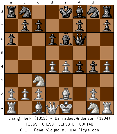 Last move : 0-1 2012 March 17 8:51:52 [Event "FICGS__CHESS__CLASS_E__000148"] [Site "FICGS"] [Date "2012.02.03"] [Round "1"] [White "Chang,Henk"] [Black "Barradas,Anderson"] [Result "0-1"] [WhiteElo "1332"] [BlackElo "1294"] 1.e4 e5 2.f4 exf4 3.Nf3 d6 4.d4 g5 5.h4 g4 6.Ng1 Qf6 7.Nc3 Be6 8.Be2 a6 0-1 This chess game has been lost on time (started : 2012.02.03 18:52:23) KGA : Fischer defense Player Black won this chess game. Follow this game move after move (download)Fischer, who may or may not be mad as a hatter, has every right to be horrified. (Jeremy Silman) Wer sich die Fähigkeit anerziehen will im Schach selbstständig zu denken, der muß alles meiden, was leblos ist: ausgeklügelte Theorien, die sich auf sehr wenige Beispiele und eine Menge Hirngespinste stützen. (Emanuel Lasker) Un Peón pasado es un criminal, quién debe ser mantenido bajo candado y llave. Leves medidas, tales como vigilancia policiaca, no son suficientes. (Aaron Nimzovich) J'ai vu le vaincu d'Echecs jouer des années durant dans l'espoir de la fête de la victoire. Car tu es plus riche de ce qu'elle existe si même elle n'est point pour toi. Ainsi de la perle du fond des mers. (Antoine de Saint-Exupéry) I don't diet. I just don't eat as much as I'd like to. (Linda Evangelista, supermodel)
