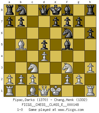 Last move : 1-0 2012 March 18 9:20:19 [Event "FICGS__CHESS__CLASS_E__000148"] [Site "FICGS"] [Date "2012.02.03"] [Round "1"] [White "Pipac,Darko"] [Black "Chang,Henk"] [Result "1-0"] [WhiteElo "1370"] [BlackElo "1332"] 1.e4 c6 2.Nc3 d5 3.exd5 cxd5 4.d4 Nf6 5.Nf3 Bf5 6.h3 h6 7.Bb5+ 1-0 This chess game has been lost on time (started : 2012.02.03 18:52:23) Caro-Kann defense Player White won this chess game. Follow this game move after move (download)As one by one I mowed them down, my superiority soon became apparent. (Jose Capablanca) Frage des Reporters: -Welche besonderen Umstände rechtfertigen das Anhalten der Uhren während einer Turnierpartie? Antwort: -Einen Fotographen zu strangulieren. (Siegbert Tarrasch) El Ajedrez es en su esencia, un juego. En su forma, un arte. Y en su ejecución, una ciencia. (Baron Tassilo) Aux échecs, l'amour-propre est satisfait quand on remporte la victoire, mais il n'y a pas de honte à être battu. (Benjamin Franklin) There are two types of people in this world, good and bad. The good sleep better, but the bad seem to enjoy the waking hours much more. (Woody Allen)