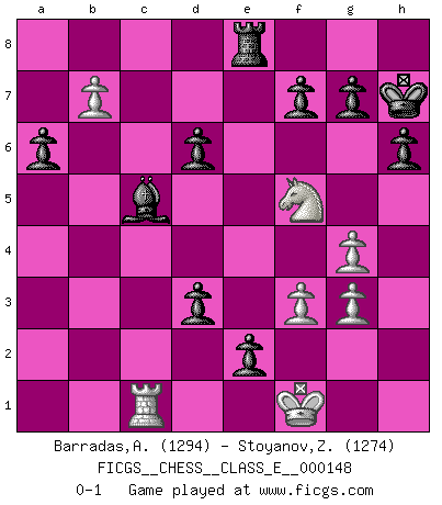 Last move : 0-1 2012 February 5 19:34:12 [Event "FICGS__CHESS__CLASS_E__000148"] [Site "FICGS"] [Date "2012.02.03"] [Round "1"] [White "Barradas,Anderson"] [Black "Stoyanov,Zdravko"] [Result "0-1"] [WhiteElo "1294"] [BlackElo "1274"] 1.e4 c5 2.Nf3 a6 3.d4 cxd4 4.Nxd4 e5 5.Nf3 d6 6.h3 h6 7.Nc3 Nc6 8.a3 Nf6 9.Bd3 Be7 10.Be3 O-O 11.O-O b5 12.b4 Bb7 13.Be2 Rc8 14.Nd5 Nxd5 15.Qxd5 Na5 16.Qd2 Nc4 17.Bxc4 bxc4 18.c3 Bxe4 19.a4 Kh7 20.Qd1 Bd3 21.Re1 Bf6 22.a5 e4 23.Bb6 Qd7 24.Nd4 Rfe8 25.Qg4 Qxg4 26.hxg4 Bg5 27.Nf5 Rc6 28.g3 Bd2 29.Red1 Bxc3 30.Rac1 Bxb4 31.f3 e3 32.Rxd3 Rxb6 33.axb6 cxd3 34.b7 Bc5 35.Kf1 e2+ 0-1 Sicilian : O'Kelly variation Kingside Castling by player Black (move 10) Kingside Castling by player White (move 11) Player Black won this chess game. Follow this game move after move (download)Openings teach you openings. Endgames teach you chess ! (Stephan Gerzadowicz) Schach ist die gewalttätigste aller Sportarten. (Garry Kasparov) El Ajedrez es un expediente tonto que hace creer a la gente inactiva que hacen una cosa muy astuta cuando solamente estan perdiendo su tiempo. (George Bernard Shaw) Shah mat. Le roi est mort. Cri de fierté d'un joueur venant de terrasser son adversaire, courtoisement, sans effusion de sang. Information on the Internet is subject to the same rules and regulations as conversation at a bar. (George Lundberg)