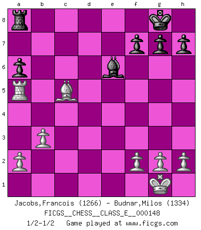 Last move : 1/2-1/2 2012 April 5 7:44:20 [Event "FICGS__CHESS__CLASS_E__000148"] [Site "FICGS"] [Date "2012.02.03"] [Round "1"] [White "Jacobs,Francois"] [Black "Budnar,Milos"] [Result "1/2-1/2"] [WhiteElo "1266"] [BlackElo "1334"] 1.e4 e5 2.Nf3 Nc6 3.Bc4 Nf6 4.d4 d5 5.exd5 Nxd5 6.Bb5 exd4 7.Qxd4 Qd7+ 8.Bxc6 bxc6 9.O-O Ne7 10.Qe3 Qe6 11.Nc3 Qxe3 12.Bxe3 Be6 13.Rfd1 Nd5 14.Nxd5 Bxd5 15.Nd4 Bd6 16.b3 O-O 17.c4 Be4 18.Rac1 c5 19.Nb5 Rfd8 20.Nxd6 cxd6 21.Rd2 d5 22.cxd5 Rxd5 23.Rxd5 Bxd5 24.Rxc5 Be6 25.Ra5 a6 26.Bc5 1/2-1/2 Two knights defense Kingside Castling by player White (move 9) Kingside Castling by player Black (move 16) This chess game ended in a draw. Follow this game move after move (download)It is not enough to be a good player... you must also play well. (Siegbert Tarrasch) Ich trinke, ich rauche, ich spiele, ich liebe Frauen aber Fernschach ist ein Laster, das ich nicht habe. (Mikhail Nekhemyevich Tal) ¿Quién es tu oponente esta tarde? Esta tarde mi oponente son las piezas negras. (Akiba Rubinstein) D'abord les bases : Jouez et étudiez, puis étudiez et jouez, ensuite jouez et étudiez, puis étudiez et jouez. Deuxièmement : Donnez toujours le meilleur de vous-même ! (Ken Smith) When you don't know what to do, walk fast and look worried. (Anonymous)