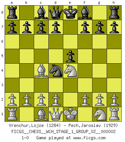 Last move : 1-0 2007 February 19 8:56:28 [Event "FICGS__CHESS__WCH_STAGE_1_GROUP_02__000002"] [Site "FICGS"] [Date "2007.01.16"] [Round "1"] [White "Vrenchur,Lojze"] [Black "Pech,Jaroslav"] [Result "1-0"] [WhiteElo "1284"] [BlackElo "1929"] 1.e4 e5 2.Bc4 Nf6 3.Nc3 Nc6 4.Qf3 Nd4 5.Qd1 Nxe4 6.Nxe4 1-0 Bishop's Opening : Berlin defense Player White won this chess game. Follow this game move after move (download)Of Chess it has been said that life is not long enough for it, but that is the fault of life, not Chess. (William Ewart Napier) Mit Schach schule ich mein Gefühl für Geometrie, was für Tennis und Schach gleichermaßen wichtig ist. (Boris Becker) Combinaciones deslumbrantes son para la mayoría, mover madera es para los pocos. (Georg Kieninger) On n'a jamais que l'âge auquel on a commence à jouer aux échecs car après on cesse de vieillir. (Capablanca) The Internet is the world's largest library. It's just that all the books are on the floor. (John Allen Paulos)