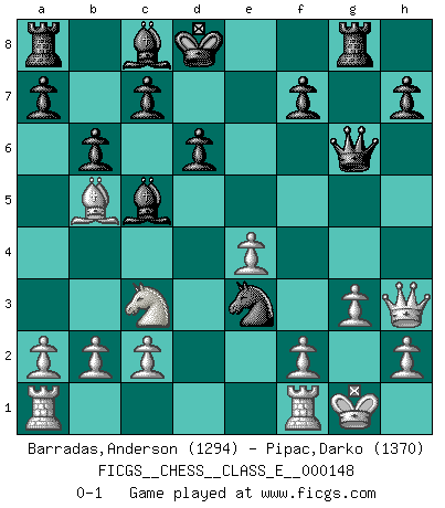 Last move : 0-1 2012 February 12 22:56:13 [Event "FICGS__CHESS__CLASS_E__000148"] [Site "FICGS"] [Date "2012.02.03"] [Round "1"] [White "Barradas,Anderson"] [Black "Pipac,Darko"] [Result "0-1"] [WhiteElo "1294"] [BlackElo "1370"] 1.e4 e5 2.Nf3 Nc6 3.d4 exd4 4.Nxd4 Nxd4 5.Qxd4 b6 6.Bc4 Bc5 7.Qxg7 Qf6 8.Qg3 Nh6 9.O-O Rg8 10.Qh3 Ng4 11.Be3 d6 12.Bb5+ Kd8 13.Nc3 Qg6 14.g3 Nxe3 0-1 Scotch game Kingside Castling by player White (move 9) Player Black won this chess game. Follow this game move after move (download)Don't even mention losing to me. I can't stand to think of it. (Bobby Fischer) Ich verachte Kasparow. (Viktor Kortschnoi) Con o sin el título, Bobby Fischer fue sin lugar a dudas el mas grande jugador de su época. (Burt Hochberg) Ce qui caractérise les parties de combat, c'est que si le défenseur a constamment de difficiles problèmes à résoudre, l'attaquant doit chercher sans relâche de nouvelles possibilités d'attaque. (Koblentz) Lottery : A tax on people who are bad at math. (Author unknown)