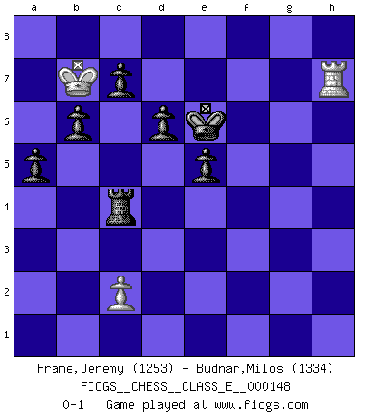 Last move : 0-1 2012 April 12 15:35:51 [Event "FICGS__CHESS__CLASS_E__000148"] [Site "FICGS"] [Date "2012.02.03"] [Round "1"] [White "Frame,Jeremy"] [Black "Budnar,Milos"] [Result "0-1"] [WhiteElo "1253"] [BlackElo "1334"] 1.e4 e5 2.Nf3 Nc6 3.Bc4 Nf6 4.Nc3 Bb4 5.d3 O-O 6.Bg5 d6 7.h3 Bxc3 8.bxc3 h6 9.Bh4 Na5 10.Qd2 Nxc4 11.dxc4 g5 12.Nxg5 Re8 13.Nf3 Kh7 14.g4 Nxe4 15.Qd5 Ng5 16.Nxg5+ hxg5 17.Qxf7+ Kh6 18.Qh5+ Kg7 19.Bxg5 Qd7 20.Qh6+ Kg8 21.Qh4 Qh7 22.Qxh7+ Kxh7 23.O-O-O Rg8 24.Be3 Rg6 25.Rdg1 b6 26.f3 Bb7 27.Rf1 Rf8 28.h4 Rxf3 29.g5 Rxe3 30.Rf7+ Rg7 31.Rhf1 Rxc3 32.h5 Be4 33.g6+ Bxg6 34.hxg6+ Kxg6 35.R1f6+ Kh7 36.Rf8 Rxc4 37.Rf1 Rh4 38.Kd2 a5 39.Kd3 Rg8 40.R8f7+ Rg7 41.a3 Rh3+ 42.Ke4 Rxa3 43.Rh1+ Kg8 44.Rf5 Ra4+ 45.Kd5 Rf4 46.Rfh5 Kf7 47.Rh7 Rfg4 48.Kc6 Rc4+ 49.Kb7 Rxh7 50.Rxh7+ Ke6 0-1 Two knights defense Kingside Castling by player Black (move 5) Queenside Castling by player White (move 23) 10 pieces endgame at move 50 : White KRP , Black KRPPPPP WHITE : King + 1 Rook 1 Pawn BLACK : King + 1 Rook 5 Pawns Player Black won this chess game. Follow this game move after move (download)The winner of the game is the player who makes the next-to-last mistake. (Savielly Tartakover) Ich las kürzlich ein Buch von Nietzsche. Er sagte Religion verdumme nur die Menschen. Ich stimme zu. (Robert James Fischer) El Ajedrez es una hermosa aventura. (Bent Larsen) Même un GMI sait rarement calculer sur plus de cinq coups une attaque à sacrifices. (Rudolf Spielmann) Real knowledge is to know the extent of one's ignorance. (Confucius)