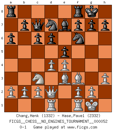 Last move : 0-1 2012 April 13 11:37:20 [Event "FICGS__CHESS__NO_ENGINES_TOURNAMENT__000052"] [Site "FICGS"] [Date "2012.02.04"] [Round "1"] [White "Chang,Henk"] [Black "Hase,Pavel"] [Result "0-1"] [WhiteElo "1332"] [BlackElo "2332"] 1.e4 d6 2.d4 Nf6 3.Nc3 c6 4.Nf3 Bg4 5.Be2 Qc7 6.O-O e5 7.h3 Bxf3 8.Bxf3 Nbd7 9.Be3 Be7 10.Qd2 O-O 11.Rad1 a6 0-1 Pirc : Ufimtsev-Pytel variation Kingside Castling by player White (move 6) Kingside Castling by player Black (move 10) Player Black won this chess game. Follow this game move after move (download)Chess is like life. (Boris Spassky) Nach Morphy wurde nichts neues mehr in der Behandlung offener Positionen gefunden. (Mikhail Moiseyevich Botvinik) Me siento como si fuera una pieza en una partida de Ajedrez, cuando mi oponente me indica: esa pieza no puede ser movida. (Soren Kierkegaard) J'ai vu le vaincu d'Echecs jouer des années durant dans l'espoir de la fête de la victoire. Car tu es plus riche de ce qu'elle existe si même elle n'est point pour toi. Ainsi de la perle du fond des mers. (Antoine de Saint-Exupéry) Man is still the most extraordinary computer of all. (John F. Kennedy)