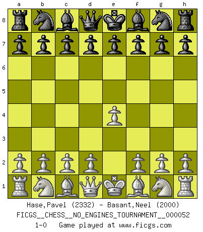 Last move : 1-0 2012 March 15 20:44:50 [Event "FICGS__CHESS__NO_ENGINES_TOURNAMENT__000052"] [Site "FICGS"] [Date "2012.02.04"] [Round "1"] [White "Hase,Pavel"] [Black "Basant,Neel"] [Result "1-0"] [WhiteElo "2332"] [BlackElo "2000"] 1.e4 1-0 This chess game has been lost on time (started : 2012.02.04 3:3:42) King's pawn Opening Player White won this chess game. Follow this game move after move (download)Life is like a game of Chess, changing with each move. (Chinese proverb) Schach ist ein Reich, wo sich die menschliche Phantasie frei entfalten kann. (David Bronstein) El Ajedrez lo es todo: arte, ciencia y deporte. (Anatoly Karpov) Aux échecs, l'amour-propre est satisfait quand on remporte la victoire, mais il n'y a pas de honte à être battu. (Benjamin Franklin) The age of a woman doesn't mean a thing. The best tunes are played on the oldest fiddles. (Ralph Waldo Emerson)