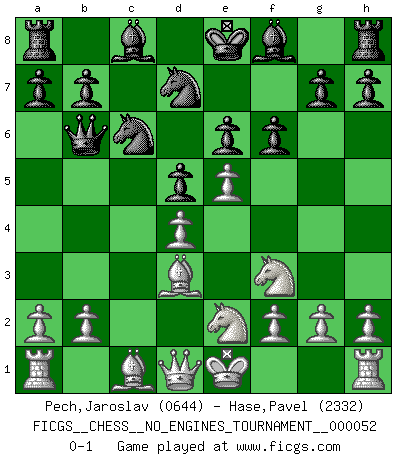 Last move : 0-1 2012 April 27 12:13:47 [Event "FICGS__CHESS__NO_ENGINES_TOURNAMENT__000052"] [Site "FICGS"] [Date "2012.02.04"] [Round "1"] [White "Pech,Jaroslav"] [Black "Hase,Pavel"] [Result "0-1"] [WhiteElo "0644"] [BlackElo "2332"] 1.e4 e6 2.d4 d5 3.Nd2 Nf6 4.e5 Nfd7 5.Bd3 c5 6.c3 Nc6 7.Ne2 Qb6 8.Nf3 cxd4 9.cxd4 f6 0-1 This chess game has been lost on time (started : 2012.02.04 3:3:42) French : Tarrasch, Closed variation Player Black won this chess game. Follow this game move after move (download)Look at Garry Kasparov. After he loses, invariably he wins the next game. He just kills the next guy. That's something that we have to learn to be able to do. (Maurice Ashley) Über Karpov: Er war und ist ein Vertreter der russischen Reaktionäre. Das steckt tief in seiner Seele, wehalb ich nicht nett mit ihm umgehen kann. (Viktor Kortschnoi) ¿Se han dado cuenta de que Fischer casi nunca ha tenido piezas malas? El las intercambia y las piezas malas se quedan con sus oponenets. (Yuri Balashov) Il n'y a pas eu de défaite parce que je ne crois pas que cet ordinateur ait jamais existé. IBM a triché en refusant d'imprimer les modes de recherche de la machine. C'est évident, pendant le match, des coups décisifs ont été joués par des êtres humains. Aujourd'hui, les meilleurs spécialistes en informatique ne peuvent toujours pas expliquer comment Deep-Blue a pu jouer contre la logique des ordinateurs. IBM a gagné une guerre de communication, mais ils sont incapables de prouver que l'ordinateur a gagné tout seul. (Garry Kasparov) Bobby never cared about money, though. His only desire was to prove that his choices were correct: He wanted chess to be important because he was a chess player, and he wanted to be important. Bobby knew money was important, but he didn't have a clue why, outside of clothes and status. The only way he could accomplish what he wanted was to fight for a lot of money. Once he got it, he gave it away. He did not know how to spend it. And once he'd become champion, after, essentially, sacrificing his life for it, he didn't know how to spend his time. (Bob Wade)
