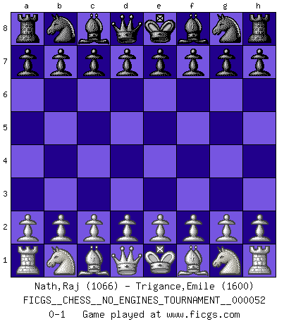 Last move : 0-1 2012 March 15 8:41:36 [Event "FICGS__CHESS__NO_ENGINES_TOURNAMENT__000052"] [Site "FICGS"] [Date "2012.02.04"] [Round "1"] [White "Nath,Raj"] [Black "Trigance,Emile"] [Result "0-1"] [WhiteElo "1066"] [BlackElo "1600"] 0-1 This chess game has been lost on time (started : 2012.02.04 3:3:42) Player Black won this chess game. Follow this game move after move (download)Chess is a foolish expedient for making idle people believe they are doing something very clever when they are only wasting their time. (George Bernard Shaw) Du musst Deinen Gegner in einen tiefen dunklen Wald führen wo 2+2=5 ist und wo der Weg, der wieder hinausführt, nur breit genug für einen ist. (Mikhail Nekhemyevich Tal) Los Peones son el alma de una partida de Ajedrez. (Francois Andre Danican Philidor) Avant la finale, les dieux ont créé le milieu de partie. (Tarrasch) Always two there are. No more no less. A master, and an apprentice. (Master Yoda in Star Wars ep.1)
