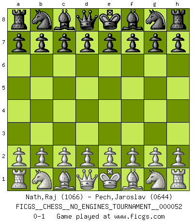 Last move : 0-1 2012 March 15 8:41:36 [Event "FICGS__CHESS__NO_ENGINES_TOURNAMENT__000052"] [Site "FICGS"] [Date "2012.02.04"] [Round "1"] [White "Nath,Raj"] [Black "Pech,Jaroslav"] [Result "0-1"] [WhiteElo "1066"] [BlackElo "0644"] 0-1 This chess game has been lost on time (started : 2012.02.04 3:3:42) Player Black won this chess game. Follow this game move after move (download)The enormous mental resilience, without which no Chess player can exist, was so much taken up by Chess that he could never free his mind of this game. (Albert Einstein) Mein erstes Ziel war nicht, die Partie zu gewinnen, sondern eine Figur zu opfern. -- der junge (Wilhelm Steinitz) El ganar no lo es todo... pero el perder es nada. (Mednis) Votre seul travail dans les ouvertures est d'obtenir un milieu de partie jouable. (Lajos Portish) The hypothalamus is one of the most important parts of the brain, involved in many kinds of motivation, among other functions. The hypothalamus controls the 'Four Fs: Fighting, Fleeing, Feeding and Mating. (Unknown author)