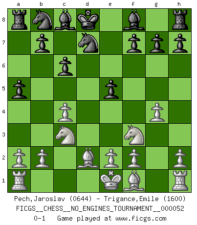 Last move : 0-1 2012 April 25 0:7:32 [Event "FICGS__CHESS__NO_ENGINES_TOURNAMENT__000052"] [Site "FICGS"] [Date "2012.02.04"] [Round "1"] [White "Pech,Jaroslav"] [Black "Trigance,Emile"] [Result "0-1"] [WhiteElo "0644"] [BlackElo "1600"] 1.d4 Nf6 2.c4 d6 3.Nc3 e5 4.dxe5 dxe5 5.Qxd8+ Kxd8 6.Nf3 Nfd7 7.Bd2 c6 8.g4 a5 0-1 This chess game has been lost on time (started : 2012.02.04 3:3:42) Old Indian : Ukrainian variation Player Black won this chess game. Follow this game move after move (download)Chess makes man wiser and clear-sighted. (Vladimir Putin) Auf jeden Fall musst du zuerst Rechtsanwalt werden, damit du deine eigenen Interessen und die deiner Familie vertreten kannst. [Brief an seinen Sohn] (José Raúl Capablanca) El Ajedrez es imaginación. (David Bronstein) Si rien de grave n'est détecté lors de l'analyse d'une position, on joue alors le coup. Seconde règle de Blumenfeld. Unless I accept my faults I will most certainly doubt my virtues. (Hugh Prather)