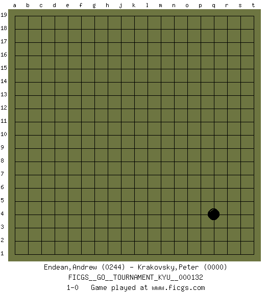 Last move : 1-0 2012 February 5 12:25:36 [Event "FICGS__GO__TOURNAMENT_KYU__000132"] [Site "FICGS"] [Date "2012.02.04"] [Round "1"] [Black "Endean,Andrew"] [White "Krakovsky,Peter"] [Result "1-0"] [Rating 1 "0244"] [Rating 2 "0000"] 1.q4 1-0 Here are the names of the openings (joseki) played in the four corners : Corner q4 : q4 1-0 Hoshi (Hwajeom, Seongjeom, Xingwei`) 4-4 Point. The star or hoshi (4-4) point, emphasizing influence at the potential expense of territory. Player Black won this Go (weiqi, baduk) game. Follow this game move after move (download)There is no territory in the centre. (Anonymous) Creativity is inventing, experimenting, growing, taking risks, breaking rules, making mistakes, and having fun. (Mary Lou Cook)