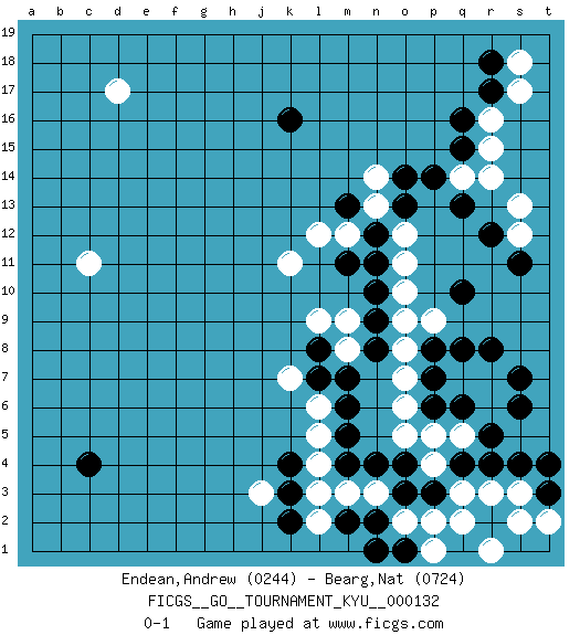 Last move : 0-1 2012 March 10 14:6:27 [Event "FICGS__GO__TOURNAMENT_KYU__000132"] [Site "FICGS"] [Date "2012.02.04"] [Round "1"] [Black "Endean,Andrew"] [White "Bearg,Nat"] [Result "0-1"] [Rating 1 "0244"] [Rating 2 "0724"] 1.q4 d17 2.c4 r16 3.k16 j3 4.q10 c11 5.k4 k11 6.q16 r15 7.r17 s17 8.r18 s18 9.q15 r14 10.r12 s12 11.s11 s13 12.q13 q14 13.p14 q3 14.p3 r3 15.r4 s3 16.s4 p2 17.o3 o2 18.n2 p4 19.o4 p5 20.q1 r1 21.o1 q2 22.t3 t2 23.t4 s2 24.n1 p1 25.q6 o5 26.n4 q5 27.r5 r6 28.s6 r7 29.s7 q7 30.r8 m3 31.m4 n3 32.m2 l3 33.k3 l2 34.k2 l4 35.m5 l5 36.m6 l6 37.m7 m8 38.l7 k7 39.l8 l9 40.n8 m9 41.p6 o6 42.p7 o7 43.p8 o8 44.n9 o9 45.n10 o10 46.n11 o11 47.n12 p9 48.q8 o12 49.o13 n13 50.m13 n14 51.o14 m12 52.m11 l12 0-1 Here are the names of the openings (joseki) played in the four corners : Corner d4 : c4 j3 Komoku (Somok, Xiao~mu`) 3-4 Point. The komoku (3-4) point is the traditional corner enclosure move.. Corner q16 : r16 q16 Komoku (Somok, Xiao~mu`) 3-4 Point. The komoku (3-4) point is the traditional corner enclosure move.. Corner q4 : q4 q3 Hoshi (Hwajeom, Seongjeom, Xingwei`) 4-4 Point. The star or hoshi (4-4) point, emphasizing influence at the potential expense of territory. Player White won this Go (weiqi, baduk) game. Follow this game move after move (download)Connect with good shape. (Anonymous) See no evil, hear no evil, speak no evil. (The 3 monkeys)