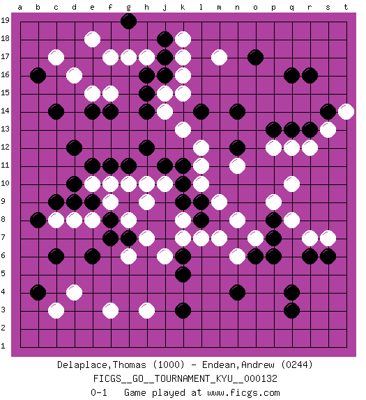 Last move : 0-1 2012 May 14 13:11:43 [Event "FICGS__GO__TOURNAMENT_KYU__000132"] [Site "FICGS"] [Date "2012.02.04"] [Round "1"] [Black "Delaplace,Thomas"] [White "Endean,Andrew"] [Result "0-1"] [Rating 1 "1000"] [Rating 2 "0244"] 1.q4 d16 2.q16 d4 3.d10 q10 4.n4 k16 5.c6 f3 6.o17 m17 7.q13 q8 8.k3 h3 9.c14 f17 10.r6 r7 11.p6 o7 12.b16 c17 13.b4 c3 14.d12 c8 15.c9 e8 16.b8 d8 17.e6 g6 18.h16 h17 19.j17 g17 20.j16 k15 21.h14 j15 22.h15 j14 23.r16 r12 24.r13 q12 25.p13 p12 26.n7 n8 27.o6 m7 28.p7 n6 29.n14 l12 30.n12 n11 31.p8 p9 32.h12 h10 33.f11 f10 34.g11 g10 35.f7 g8 36.g7 h7 37.f8 f9 38.e9 e10 39.d9 h9 40.j11 j10 41.k6 k7 42.e11 k17 43.j18 k18 44.g19 e18 45.f14 f15 46.e14 e15 47.s6 s7 48.l14 k13 49.k11 l11 50.k10 l10 51.k9 k8 52.l9 m9 53.l8 l7 54.k5 j6 55.q3 s13 56.s14 t14 0-1 This go game has been lost on time (started : 2012.02.04 16:37:7) Here are the names of the openings (joseki) played in the four corners : Corner d4 : d4 c6 Hoshi (Hwajeom, Seongjeom, Xingwei`) 4-4 Point. The star or hoshi (4-4) point, emphasizing influence at the potential expense of territory. Ikken Kakari (Hankan Keolch'im, Yi Gua`jiao~, 1-Space Low Approach). Black 2 is the standard approach move to the 4-4. Corner d16 : d16 c14 Hoshi (Hwajeom, Seongjeom, Xingwei`) 4-4 Point. The star or hoshi (4-4) point, emphasizing influence at the potential expense of territory. Ikken Kakari (Hankan Keolch'im, Yi Gua`jiao~, 1-Space Low Approach). Black 2 is the standard approach move to the 4-4. Player White won this Go (weiqi, baduk) game. Follow this game move after move (download)... {it is} something unearthly... if there are sentient beings on other planets, then they play go. (Emanuel Lasker, chess world champion) Everybody lies. (Gregory House, House M.D.)