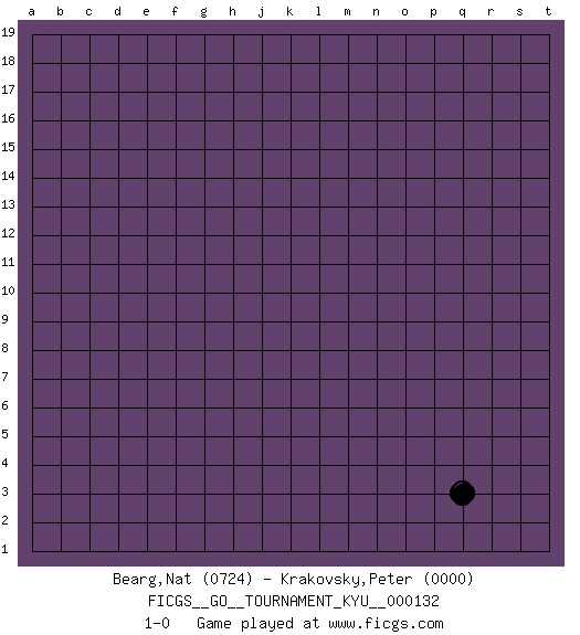 Last move : 1-0 2012 February 5 12:25:51 [Event "FICGS__GO__TOURNAMENT_KYU__000132"] [Site "FICGS"] [Date "2012.02.04"] [Round "1"] [Black "Bearg,Nat"] [White "Krakovsky,Peter"] [Result "1-0"] [Rating 1 "0724"] [Rating 2 "0000"] 1.q3 1-0 Here are the names of the openings (joseki) played in the four corners : Corner q4 : q3 1-0 Komoku (Somok, Xiao~mu`) 3-4 Point. The komoku (3-4) point is the traditional corner enclosure move.. Player Black won this Go (weiqi, baduk) game. Follow this game move after move (download)The strong player plays straight, the weak diagonally. (Anonymous) Luck has a peculiar habit of favoring those who don't depend on it. (Author unknown)