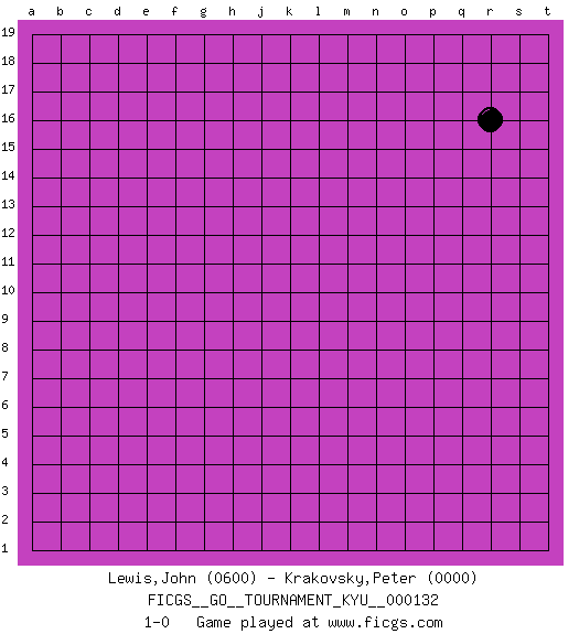 Last move : 1-0 2012 February 5 12:26:4 [Event "FICGS__GO__TOURNAMENT_KYU__000132"] [Site "FICGS"] [Date "2012.02.04"] [Round "1"] [Black "Lewis,John"] [White "Krakovsky,Peter"] [Result "1-0"] [Rating 1 "0600"] [Rating 2 "0000"] 1.r16 1-0 Here are the names of the openings (joseki) played in the four corners : Player Black won this Go (weiqi, baduk) game. Follow this game move after move (download)Don't disturb symmetry. (Anonymous) The beginning of wisdom is silence. The second step is listening. (Unknown)