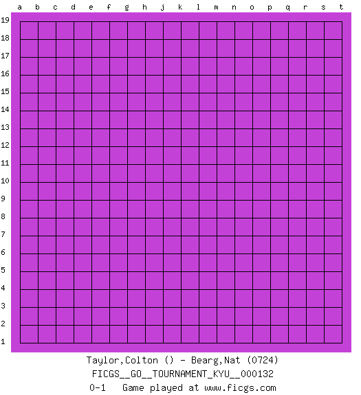 Last move : 0-1 2012 March 5 20:10:43 [Event "FICGS__GO__TOURNAMENT_KYU__000132"] [Site "FICGS"] [Date "2012.02.04"] [Round "1"] [Black "Taylor,Colton"] [White "Bearg,Nat"] [Result "0-1"] [Rating 2 "0724"] 0-1 This go game has been lost on time (started : 2012.02.04 16:37:7) Here are the names of the openings (joseki) played in the four corners : Player White won this Go (weiqi, baduk) game. Follow this game move after move (download)Pon-nuki is worth thirty points. (Anonymous) Computers make it easier to do a lot of things, but most of the things they make it easier to do don't need to be done. (Andy Rooney)