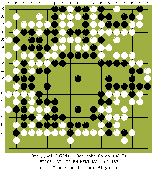 Last move : 0-1 2012 August 5 7:39:32 [Event "FICGS__GO__TOURNAMENT_KYU__000132"] [Site "FICGS"] [Date "2012.02.04"] [Round "1"] [Black "Bearg,Nat"] [White "Bezushko,Anton"] [Result "0-1"] [Rating 1 "0724"] [Rating 2 "0319"] 1.q3 d17 2.c4 r16 3.j3 q5 4.c11 r3 5.l17 j17 6.k10 d3 7.r10 r13 8.q17 r17 9.r18 s18 10.q18 q16 11.p17 n17 12.n16 o16 13.o17 m16 14.n15 m17 15.l16 m15 16.m14 p16 17.l15 n14 18.o15 o14 19.n18 m18 20.l18 m19 21.n19 p15 22.o18 p19 23.s19 s17 24.d16 e16 25.d15 c17 26.c16 j15 27.j16 h16 28.k16 h14 29.h13 g13 30.h12 l14 31.m13 k14 32.j18 h18 33.g15 h15 34.g17 h17 35.g16 g14 36.g18 f15 37.e17 e18 38.h19 k18 39.l19 j19 40.g19 f17 41.k19 j18 42.n15 n16 43.g12 f12 44.e13 f13 45.f11 e12 46.e11 d12 47.c12 c13 48.p6 p4 49.o4 p3 50.o3 q2 51.g7 d11 52.d10 d4 53.d5 e5 54.c6 g3 55.f5 e6 56.e7 d6 57.c5 d7 58.c7 d8 59.e8 c8 60.b8 b9 61.d9 c3 62.b3 b2 63.f4 f3 64.e4 f6 65.g6 b7 66.c9 a8 67.f7 b8 68.b6 b4 69.b10 a6 70.c14 d13 71.e14 b14 72.b13 b12 73.b15 a13 74.b17 b18 75.d14 a17 76.f14 a15 77.f16 b16 78.o10 q8 79.r8 r7 80.q9 s8 81.r9 p7 82.o7 o8 83.n8 o6 84.n7 o5 85.n5 n6 86.m6 p5 87.o9 p8 88.p9 q6 89.s9 s7 90.l13 g5 91.g4 h4 92.h5 e3 93.g5 h3 94.j4 n4 95.m5 n3 96.e15 e17 97.j13 k15 98.k13 b11 99.c10 a10 100.f9 l3 101.l4 m3 102.q12 q13 103.p12 p13 104.o12 k3 105.k4 j2 106.k6 s12 107.s11 r12 108.r11 n13 109.n12 t10 110.t9 t11 0-1 Here are the names of the openings (joseki) played in the four corners : Corner q4 : q3 q5 Komoku (Somok, Xiao~mu`) 3-4 Point. The komoku (3-4) point is the traditional corner enclosure move.. Ikken Takagakari (Hankan Nop'dakeolch'im, Yi Gaogua`jiao~, 1-Space High Approach). The 5-4 approach move has become more popular in modern times, as modern Go emphasizes speed and influence. Corner d16 : d17 c11 Komoku (Somok, Xiao~mu`) 3-4 Point. The komoku (3-4) point is the traditional corner enclosure move.. Corner q16 : r16 l17 Komoku (Somok, Xiao~mu`) 3-4 Point. The komoku (3-4) point is the traditional corner enclosure move.. Player White won this Go (weiqi, baduk) game. Follow this game move after move (download)When your opponent is thick, you must also become thick. (Otake Hideo, 9p) The human is the only animal species whose members are able to talk themselves into difficulties that would not otherwise exist. (Wendell Johnson)