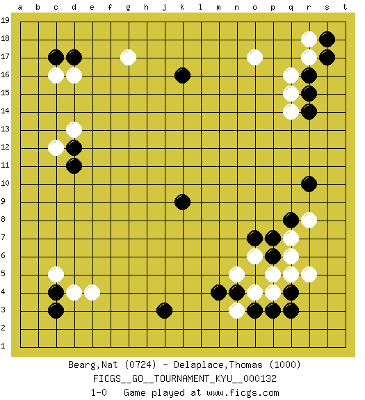 Last move : 1-0 2012 April 12 23:35:1 [Event "FICGS__GO__TOURNAMENT_KYU__000132"] [Site "FICGS"] [Date "2012.02.04"] [Round "1"] [Black "Bearg,Nat"] [White "Delaplace,Thomas"] [Result "1-0"] [Rating 1 "0724"] [Rating 2 "1000"] 1.q3 d16 2.c4 q16 3.k9 e4 4.k16 d13 5.r10 r5 6.j3 c5 7.d12 c12 8.d11 d4 9.c3 o17 10.r16 q14 11.r15 r17 12.r14 q15 13.s17 r18 14.s18 r8 15.q8 q7 16.p7 q6 17.p6 p4 18.p3 p5 19.o5 o4 20.n4 n3 21.o3 n5 22.q4 q5 23.m4 o6 24.o7 g17 25.c17 c16 26.d17 1-0 This go game has been lost on time (started : 2012.02.04 16:37:7) Here are the names of the openings (joseki) played in the four corners : Corner d4 : c4 e4 Komoku (Somok, Xiao~mu`) 3-4 Point. The komoku (3-4) point is the traditional corner enclosure move.. Ikken Takagakari (Hankan Nop'dakeolch'im, Yi Gaogua`jiao~, 1-Space High Approach). The 5-4 approach move has become more popular in modern times, as modern Go emphasizes speed and influence. Corner q4 : q3 r5 Komoku (Somok, Xiao~mu`) 3-4 Point. The komoku (3-4) point is the traditional corner enclosure move.. Ikken Kakari (Hankan Keolch'im, Yi Gua`jiao~, 1-Space Low Pincer). The small knight move is the basic approach move to the 3-4 point stone. It has been continually used for over four centuries. There are limitless variations, with new moves constantly being discovered. White 2 opens the door to a treaure store of joseki. Player Black won this Go (weiqi, baduk) game. Follow this game move after move (download)The second line is the line of defeat, the third line is the line of territory, and the fourth line is the line of influence. (Anonymous) He who defends everything defends nothing. (Frederick the Great)