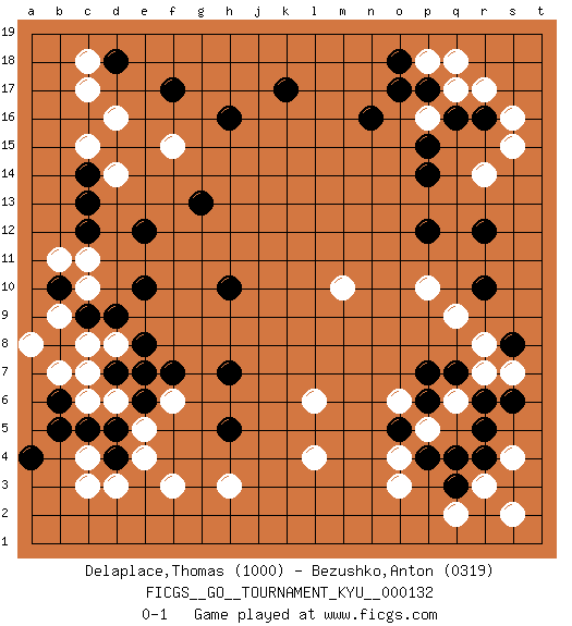 Last move : 0-1 2012 May 3 0:45:32 [Event "FICGS__GO__TOURNAMENT_KYU__000132"] [Site "FICGS"] [Date "2012.02.04"] [Round "1"] [Black "Delaplace,Thomas"] [White "Bezushko,Anton"] [Result "0-1"] [Rating 1 "1000"] [Rating 2 "0319"] 1.q4 d16 2.q16 d3 3.c5 c4 4.d5 f3 5.c9 c11 6.k17 c7 7.d7 c8 8.d9 d8 9.e8 d6 10.e7 c6 11.d4 c3 12.e6 e5 13.b5 b9 14.b10 b7 15.c14 e4 16.b6 a8 17.a4 c10 18.f17 d14 19.c13 f15 20.h16 c15 21.c12 b11 22.e12 o3 23.r6 l4 24.n16 r14 25.r10 r17 26.r16 q17 27.p17 s16 28.d18 f6 29.e10 r3 30.q3 s4 31.s6 q2 32.h5 h3 33.h7 r8 34.r12 s15 35.f7 l6 36.h10 p10 37.p12 m10 38.p7 q9 39.p14 p5 40.r4 s2 41.s8 p16 42.p15 p18 43.o17 c17 44.g13 c18 45.o18 q6 46.r5 q18 47.p4 o4 48.q7 r7 49.p6 s7 50.o5 o6 0-1 This go game has been lost on time (started : 2012.02.04 16:37:7) Here are the names of the openings (joseki) played in the four corners : Corner d4 : d3 c5 Komoku (Somok, Xiao~mu`) 3-4 Point. The komoku (3-4) point is the traditional corner enclosure move.. Ikken Kakari (Hankan Keolch'im, Yi Gua`jiao~, 1-Space Low Pincer). The small knight move is the basic approach move to the 3-4 point stone. It has been continually used for over four centuries. There are limitless variations, with new moves constantly being discovered. Black 2 opens the door to a treaure store of joseki. Corner q4 : q4 o3 Hoshi (Hwajeom, Seongjeom, Xingwei`) 4-4 Point. The star or hoshi (4-4) point, emphasizing influence at the potential expense of territory. Ikken Kakari (Hankan Keolch'im, Yi Gua`jiao~, 1-Space Low Approach). White 2 is the standard approach move to the 4-4. Player White won this Go (weiqi, baduk) game. Follow this game move after move (download)I really believe that Go is destined to take the place of Chess as the leading intellectual game of the Occident, just as it has reigned supreme in the Orient for some four thousand years. (Edward Lasker, international chess master) Perhaps chess is the wrong game for the times (The Chess Master and the Computer, by Garry Kasparov - 2010)