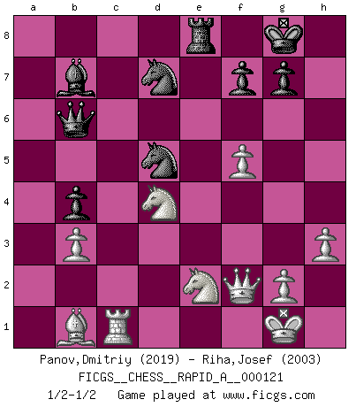 Last move : 1/2-1/2 2012 April 17 10:46:30 [Event "FICGS__CHESS__RAPID_A__000121"] [Site "FICGS"] [Date "2012.02.11"] [Round "1"] [White "Panov,Dmitriy"] [Black "Riha,Josef"] [Result "1/2-1/2"] [WhiteElo "2019"] [BlackElo "2003"] 1.e4 e5 2.Nf3 Nc6 3.Bb5 a6 4.Ba4 Nf6 5.O-O Be7 6.Re1 b5 7.Bb3 d6 8.c3 O-O 9.h3 Na5 10.Bc2 c5 11.d4 Qc7 12.Nbd2 cxd4 13.cxd4 Nc6 14.Nb3 a5 15.Be3 a4 16.Nbd2 Bd7 17.Rc1 Qb7 18.Qe2 h6 19.Nf1 Rfe8 20.Ng3 Rab8 21.Bd3 exd4 22.Nxd4 Ne5 23.Bb1 Bf8 24.b3 Ng6 25.f4 Rbc8 26.Rxc8 Rxc8 27.Qf2 Re8 28.Bc1 h5 29.Qf3 Qa7 30.Be3 Qa5 31.Rc1 Rc8 32.Rf1 b4 33.Re1 h4 34.Nge2 Re8 35.Bf2 Qa8 36.f5 Ne5 37.Qf4 d5 38.exd5 axb3 39.axb3 Qxd5 40.Bxh4 Be7 41.Qf1 Bc5 42.Bf2 Qd6 43.Kh1 Bc8 44.Rd1 Bb7 45.Nf3 Qc7 46.Bxc5 Qxc5 47.Nfd4 Nd5 48.Qf2 Nd7 49.Kg1 Qb6 50.Rc1 1/2-1/2 Ruy Lopez : Closed Kingside Castling by player White (move 5) Kingside Castling by player Black (move 8) This chess game ended in a draw. Follow this game move after move (download)By playing at Chess then, we may learn: First: Foresight... Second: Circumspection... Third: Caution... And lastly, we learn by Chess the habit of not being discouraged by present bad appearances in the state of our affairs, the habit of hoping for a favorable chance, and that of persevering in the secrets of resources. (Benjamin Franklin) Charakterschwächen offenbaren sich normalerweise während einer Schachpartie. (Garry Kasparov) Cuando me preguntan: -¿Cual es el secreto que te hace hacer mejores movidas que tus oponentes?, Yo respondo: Me da gusto que me pregunten eso, porque, como veran, hay una simple razón. Yo pienso mis propias movidas y dejo a mi oponente que el piense las suyas. (Alexander Alekhine) Nous vivons dans un monde échiquéen : chaque jour qui passe est un défi à relever. (Philosophe Sasha) I teach you to lie, cheat and steal, and as soon as my back's turned you wait in line ? (Gregory House, House M.D.)