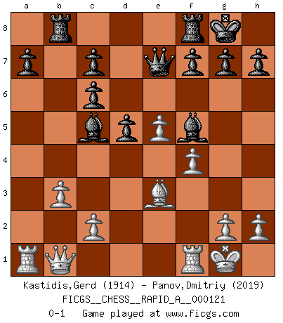 Last move : 0-1 2012 April 19 18:45:16 [Event "FICGS__CHESS__RAPID_A__000121"] [Site "FICGS"] [Date "2012.02.11"] [Round "1"] [White "Kastidis,Gerd"] [Black "Panov,Dmitriy"] [Result "0-1"] [WhiteElo "1914"] [BlackElo "2019"] 1.e4 e5 2.Nf3 Nc6 3.d4 exd4 4.Bc4 Nf6 5.e5 d5 6.Bb5 Ne4 7.Nxd4 Bd7 8.Bxc6 bxc6 9.O-O Bc5 10.Be3 Qe7 11.f4 Rb8 12.b3 O-O 13.Nd2 Nc3 14.Qe1 Bb4 15.a3 Bxa3 16.Nb1 Nxb1 17.Qxb1 Bc5 18.Nf5 Bxf5 0-1 Scotch gambit : Dubois-Reti defense Kingside Castling by player White (move 9) Kingside Castling by player Black (move 12) Player Black won this chess game. Follow this game move after move (download)I'd rather have a Pawn than a finger. (Reuben Fine) Ich habe die besten Aussichten, den ersten Preis zu gewinnen - denn jeder muss gegen Steinitz spielen, nur ich nicht! (Wilhelm Steinitz) Debemos de asegurarnos de que el Ajedrez no se convierta en un lenguaje muerto, muy interesante, pero solo para un grupo muy pequeño. (Sytze Faber) L'attaque fait le spectacle, la défense gagne les matchs. (Dicton footballistique) I've lost money so fast in these clubs it's left me reeling. I've read every poker book ever written, but the only way to get better at the game is to go out and play with people who are really good. The problem is, you stand to lose a lot of money doing it. (Matt Damon)