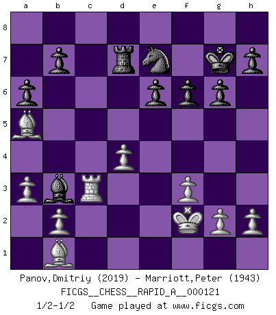 Last move : 1/2-1/2 2012 May 28 16:17:51 [Event "FICGS__CHESS__RAPID_A__000121"] [Site "FICGS"] [Date "2012.02.11"] [Round "1"] [White "Panov,Dmitriy"] [Black "Marriott,Peter"] [Result "1/2-1/2"] [WhiteElo "2019"] [BlackElo "1943"] 1.e4 c6 2.d4 d5 3.exd5 cxd5 4.c4 e6 5.Nc3 Nf6 6.Nf3 Bb4 7.cxd5 Nxd5 8.Bd2 Nc6 9.Bd3 O-O 10.O-O Be7 11.a3 Bf6 12.Qc2 g6 13.Bh6 Re8 14.Rad1 Bd7 15.Ne4 Qb6 16.Nxf6+ Nxf6 17.Qc5 Nd5 18.Qxb6 Nxb6 19.Rfe1 Nd5 20.Bc4 Na5 21.Ba2 Ba4 22.Rc1 Bb3 23.Bb1 Nc4 24.Nd2 Nxd2 25.Bxd2 Rac8 26.f3 Kg7 27.Be4 Red8 28.Kf2 Rxc1 29.Rxc1 Rd7 30.Bd3 a6 31.Bb1 f6 32.Ba5 Ne7 33.Rc3 1/2-1/2 Caro-Kann : Panov-Botvinnik attack Kingside Castling by player Black (move 9) Kingside Castling by player White (move 10) This chess game ended in a draw. Follow this game move after move (download)Bobby is the most misunderstood, misquoted celebrity walking the face of this earth. (Yasser Seirawan) Über Frauen: Chess is better. (Robert James Fischer) Personalmente, yo prefiero mirar hacia el futuro en donde un programa de computadora gane el título mundial de Ajedrez. La humanidad necesita una lección de humildad. (Richard Dawkings) Les réformistes prétendent que les progrès de la théorie conduiront à la disparition des échecs, et qu'il faut, pour leur rendre vie, en remanier les règles. En réalité, qu'exprime cette affirmation? Le mépris de l'intuition, de l'imagination et de tous les autres éléments qui font des échecs un art. (Alexander Alekhine) A good book on your shelf is a friend that turns its back on you and remains a friend. (Author unknown)