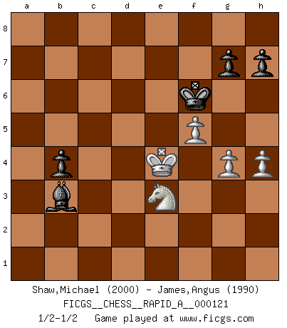Last move : 1/2-1/2 2012 April 29 16:3:41 [Event "FICGS__CHESS__RAPID_A__000121"] [Site "FICGS"] [Date "2012.02.11"] [Round "1"] [White "Shaw,Michael"] [Black "James,Angus"] [Result "1/2-1/2"] [WhiteElo "2000"] [BlackElo "1990"] 1.d4 Nf6 2.c4 e6 3.g3 c5 4.Nf3 cxd4 5.Nxd4 a6 6.Bg2 Qc7 7.Qd3 d5 8.Nd2 e5 9.Nc2 dxc4 10.Nxc4 Be6 11.b3 Nc6 12.O-O Rd8 13.Qc3 Nd5 14.Bxd5 Rxd5 15.Be3 Bc5 16.Rfd1 Bxe3 17.N4xe3 Rxd1+ 18.Rxd1 O-O 19.Nd5 Qb8 20.Qc5 Rd8 21.e4 Bg4 22.Rd3 Kh8 23.f3 Be6 24.Kg2 f5 25.exf5 Bxf5 26.Rd1 e4 27.f4 Bg4 28.Rd2 Be6 29.Nce3 Rd7 30.f5 Bf7 31.Rd1 Qd8 32.Qb6 Qxb6 33.Nxb6 Rd3 34.Rxd3 exd3 35.Na4 b5 36.Nb2 d2 37.Kf3 a5 38.Ke2 Nb4 39.a3 Nc6 40.Kxd2 Bxb3 41.Kd3 Kg8 42.Ke4 Kf7 43.Nd3 b4 44.axb4 Nxb4 45.Nxb4 axb4 46.g4 Kf6 47.h4 1/2-1/2 Catalan Opening Kingside Castling by player White (move 12) Kingside Castling by player Black (move 18) 10 pieces endgame at move 45 : White KNPPP , Black KBPPP WHITE : King + 1 Knight 3 Pawns BLACK : King + 1 Bishop 3 Pawns This chess game ended in a draw. Follow this game move after move (download)Chess is a fairy tale of 1001 blunders. (Savielly Tartakower) Wenn ich gewinne bin ich ein Genie. Wenn nicht, dann bin ich keines. (Robert James Fischer) En un gambito tu regalas un Peón por el bién de tomar un juego perdido. (Samuel Standige Boden) Votre seul travail dans les ouvertures est d'obtenir un milieu de partie jouable. (Lajos Portish) Whenever people agree with me, I always feel I must be wrong. (Oscar Wilde)