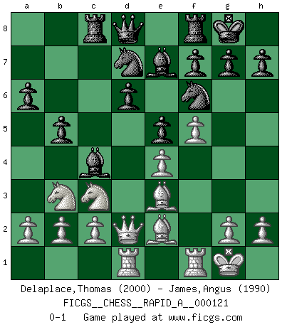 Last move : 0-1 2012 April 7 11:26:23 [Event "FICGS__CHESS__RAPID_A__000121"] [Site "FICGS"] [Date "2012.02.11"] [Round "1"] [White "Delaplace,Thomas"] [Black "James,Angus"] [Result "0-1"] [WhiteElo "2000"] [BlackElo "1990"] 1.e4 c5 2.Nf3 d6 3.d4 cxd4 4.Nxd4 Nf6 5.Nc3 a6 6.Be3 e5 7.Nb3 Be6 8.Qd2 Nbd7 9.Be2 b5 10.O-O Be7 11.Rad1 O-O 12.f4 Rc8 13.f5 Bc4 0-1 This chess game has been lost on time (started : 2012.02.11 1:35:47) Sicilian : Najdorf, Byrne (English) attack Kingside Castling by player White (move 10) Kingside Castling by player Black (move 11) Player Black won this chess game. Follow this game move after move (download)He who takes the Queen's Knight's Pawn will sleep in the streets. (Anonymous) Im Fernschach kannst du während dem Spiel rauchen. (John Christen Knudsen) La única cosa que los jugadores de Ajedrez tienen en común, es el Ajedrez. (Lodewijk Prins) Mais l'homme est une créature légère et illogique : semblable au joueur d'échecs, il n'aime que le processus du but à atteindre, non le but lui-même. (Dostoïevsky) A generalist learns less and less about more and more until he knows nothing about everything. (Author unknown)