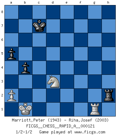 Last move : 1/2-1/2 2012 May 21 9:15:42 [Event "FICGS__CHESS__RAPID_A__000121"] [Site "FICGS"] [Date "2012.02.11"] [Round "1"] [White "Marriott,Peter"] [Black "Riha,Josef"] [Result "1/2-1/2"] [WhiteElo "1943"] [BlackElo "2003"] 1.d4 Nf6 2.c4 e6 3.Nf3 d5 4.Nc3 c6 5.Bg5 dxc4 6.e4 b5 7.e5 h6 8.Bh4 g5 9.Nxg5 hxg5 10.Bxg5 Nbd7 11.exf6 Bb7 12.h4 Nxf6 13.Qf3 Be7 14.O-O-O Nd5 15.Bxe7 Qxe7 16.Ne4 O-O-O 17.h5 f6 18.g4 Kb8 19.Qg3+ Ka8 20.Bg2 Bc8 21.h6 Qf8 22.h7 Rd7 23.g5 fxg5 24.Nxg5 Rg7 25.Be4 c3 26.f4 Nxf4 27.Kb1 Qb4 28.Rh2 e5 29.Bxc6+ Kb8 30.Be4 Be6 31.Rg1 Qxd4 32.bxc3 Qd7 33.Qe3 Bf5 34.Ka1 Bxe4 35.Nxe4 R8xh7 36.Nf6 Qd3 37.Qxe5+ Kc8 38.Qc5+ Rc7 39.Qf8+ Kb7 40.Nxh7 Qxc3+ 41.Rb2 Nd3 42.Qf3+ Rc6 43.Qf7+ Kb6 44.Qb3 Qxb2+ 45.Qxb2 Nxb2 46.Kxb2 Rh6 47.Nf8 Rh2+ 48.Kb1 a5 49.Nd7+ Kc7 50.Nc5 b4 51.Nd3 1/2-1/2 Queen's pawn game Queenside Castling by player White (move 14) Queenside Castling by player Black (move 16) 10 pieces endgame at move 45 : White KQRNP , Black KRNPP WHITE : King + 1 Queen 1 Rook 1 Knight 1 Pawn BLACK : King + 1 Rook 1 Knight 2 Pawns 9 pieces endgame at move 45 : White KRNP , Black KRNPP WHITE : King + 1 Rook 1 Knight 1 Pawn BLACK : King + 1 Rook 1 Knight 2 Pawns 8 pieces endgame at move 46 : White KRNP , Black KRPP WHITE : King + 1 Rook 1 Knight 1 Pawn BLACK : King + 1 Rook 2 Pawns This chess game ended in a draw. Follow this game move after move (download)When in doubt... play Chess ! (Tevis) Gewinnen beim Schach fördert das Selbstvertrauen. Beim Sex spüre ich sowas nicht... (Garry Kasparov) Mi estilo es algo parecido entre un poco de Tal y Petrosian. (Reshevsky) Je menace de comprendre la position. (Anonyme) Do you know these so called Volunteers don't even get paid! (Simpsons)