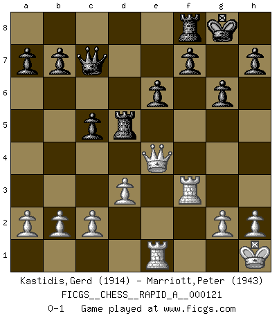 Last move : 0-1 2012 May 17 1:19:56 [Event "FICGS__CHESS__RAPID_A__000121"] [Site "FICGS"] [Date "2012.02.11"] [Round "1"] [White "Kastidis,Gerd"] [Black "Marriott,Peter"] [Result "0-1"] [WhiteElo "1914"] [BlackElo "1943"] 1.e4 c5 2.Nc3 d6 3.f4 Nc6 4.Nf3 g6 5.Bb5 Bg7 6.O-O Bd7 7.d3 Nf6 8.e5 dxe5 9.fxe5 Ng4 10.Bxc6 Bxc6 11.Bf4 Nxe5 12.Nxe5 Qd4+ 13.Kh1 Bxe5 14.Bxe5 Qxe5 15.Qd2 Qc7 16.Rae1 O-O 17.Ne4 Rad8 18.Qe3 Bxe4 19.Qxe4 e6 20.Rf3 Rd5 0-1 This chess game has been lost on time (started : 2012.02.11 1:35:47) Sicilian : Closed Kingside Castling by player White (move 6) Kingside Castling by player Black (move 16) Player Black won this chess game. Follow this game move after move (download)By the beauty of his games, the clarity of his play, and the brilliance of his ideas, Fischer made himself an artist of the same stature as Brahms, Rembrandt, and Shakespeare. (David Levy) Der vorletzte Fehler gewinnt. (Savielly Grigorievitsch Tartakower) Haz el enroque temprano y seguido. (Rob Sillars) A ce moment-là, je menaçais de comprendre la position ! (Clément L'Heureux) In fact if nothing is done against this teddy bear, hereby I announce that I would quit chess, rapid chess, blitz chess, postal chess, email chess, server chess and correspondence chess I will then switch to a table game where teddy bears aren't going to be seen for a while, like Poker, or Roulette, all 18+ games. (Elmer Valderrama)