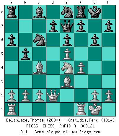 Last move : 0-1 2012 April 11 11:31:41 [Event "FICGS__CHESS__RAPID_A__000121"] [Site "FICGS"] [Date "2012.02.11"] [Round "1"] [White "Delaplace,Thomas"] [Black "Kastidis,Gerd"] [Result "0-1"] [WhiteElo "2000"] [BlackElo "1914"] 1.e4 c5 2.Nf3 g6 3.Bc4 Bg7 4.O-O e6 5.d4 cxd4 6.Nxd4 Nc6 7.Nb5 Be5 8.f4 Bb8 9.Be3 a6 10.Nd6+ Bxd6 11.Qxd6 Qe7 12.Qd2 Nf6 13.Nc3 O-O 14.e5 Ne8 15.Ne4 b5 0-1 This chess game has been lost on time (started : 2012.02.11 1:35:47) Sicilian : Hungarian variation Kingside Castling by player White (move 4) Kingside Castling by player Black (move 13) Player Black won this chess game. Follow this game move after move (download)When the Chess game is over, the Pawn and the King go back to the same box. (Irish saying) Je mehr wir mit Computern analysieren, desto mehr glauben wir an Verteidigung. (Vladimir Kramnik) Bobby es el jugador de Ajedrez mas fino que este país jamás haya producido. Su memoria para las movidas, su brillantez en soñar combinaciones y su feróz determinación por la victoria son algo extraño. (John Collins) Plusieurs personnes se sont demandées comment Tal faisait pour gagner... En fait, c'est très simple ! Il met ses pièces au centre de l'échiquier et les sacrifie quelque part ! (David Bronstein) To err is human, but to really foul things up requires a computer. (Farmer's Almanac, 1978)