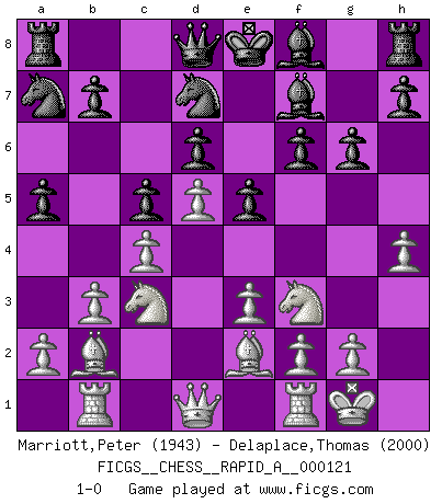 Last move : 1-0 2012 April 16 23:45:17 [Event "FICGS__CHESS__RAPID_A__000121"] [Site "FICGS"] [Date "2012.02.11"] [Round "1"] [White "Marriott,Peter"] [Black "Delaplace,Thomas"] [Result "1-0"] [WhiteElo "1943"] [BlackElo "2000"] 1.b3 e5 2.Bb2 Nc6 3.c4 Nge7 4.Nf3 f6 5.e3 d6 6.Nc3 Be6 7.d4 Bf7 8.d5 Nb8 9.h4 c6 10.Be2 Nd7 11.O-O c5 12.Rb1 g6 13.Ba3 a5 14.Nb5 Nc8 15.Bb2 Na7 16.Nc3 1-0 This chess game has been lost on time (started : 2012.02.11 1:35:47) Nimzovich-Larsen attack : Modern variation Kingside Castling by player White (move 11) Player White won this chess game. Follow this game move after move (download)You can only get good at Chess if you love the game. (Bobby Fischer) Schach ist ein Reich, wo sich die menschliche Phantasie frei entfalten kann. (David Bronstein) La última cosa en que Fischer estaba interesado era en tonterías, siempre y cuando el Ajedrez estuviera involucrado. (Elie Agur) Vous m'avez demandé de vous exposer quel est le fondement de la prière. Je ne fais que préparer les pièces du jeu sur la table... Nous sera-t-il permis d'en adopter les règles et si nous les appliquons scrupuleusement nous ne tarderons pas à faire mat le Roi divin ! Il ne pourra échapper à nos mains. (Sainte Thérèse d'Avila, Chemin de perfection) A good teacher is like a candle - it consumes itself to light the way for others. (Author unknown)