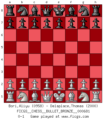 Last move : 0-1 2012 February 12 19:22:12 [Event "FICGS__CHESS__BULLET_BRONZE__000681"] [Site "FICGS"] [Date "2012.02.12"] [Round "1"] [White "Bori,Aliyu"] [Black "Delaplace,Thomas"] [Result "0-1"] [WhiteElo "0958"] [BlackElo "2000"] 0-1 This chess game has been lost on time (started : 2012.02.12 17:4:58) Player Black won this chess game. Follow this game move after move (download)Chess is a beautiful mistress. (Bent Larsen) Ein unbeabsichtigtes Patt ist der Gipfel der Dummheit. (Anonymous) El poder defensivo de una pieza clavada, solamente es imaginario. (Aaron Nimzovich) Nous vivons dans un monde échiquéen : chaque jour qui passe est un défi à relever. (Philosophe Sasha) Tomorrow's what you make of it. (Horatio Caine, C.S.I. Miami)