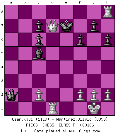 Last move : 1-0 2012 June 10 15:58:30 [Event "FICGS__CHESS__CLASS_F__000106"] [Site "FICGS"] [Date "2012.02.14"] [Round "1"] [White "Usan,Kavi"] [Black "Martinez,Silvio"] [Result "1-0"] [WhiteElo "1119"] [BlackElo "0990"] 1.e4 e5 2.Nf3 Nc6 3.d4 d5 4.exd5 Qxd5 5.Nc3 Qe6 6.d5 Qd6 7.Bb5 Bd7 8.dxc6 Bxc6 9.O-O O-O-O 10.Qe2 Ne7 11.Nxe5 f6 12.Nf7 Qc5 13.Be3 Bxb5 14.Nxb5 Qb4 15.Nxa7+ Kb8 16.Nxd8 Qxb2 17.Rab1 Qxa2 18.Nac6+ Nxc6 19.Nxc6+ Kc8 20.Qd3 bxc6 21.Qf5+ Kd8 22.Rfd1+ Bd6 23.Rb8+ Ke7 24.Rxh8 h6 25.Bc5 Bxc5 26.Qd7+ 1-0 Scotch Opening Kingside Castling by player White (move 9) Queenside Castling by player Black (move 9) Player White won this chess game. Follow this game move after move (download)The laws of Chess do not permit a free choice: you have to move whether you like it or not. (Emanuel Lasker) Moralische Siege zählen nicht. (Savielly Grigorievitsch Tartakower) Cuando me preguntan: -¿Cual es el secreto que te hace hacer mejores movidas que tus oponentes?, Yo respondo: Me da gusto que me pregunten eso, porque, como veran, hay una simple razón. Yo pienso mis propias movidas y dejo a mi oponente que el piense las suyas. (Alexander Alekhine) Les sacrifices démontrent seulement que quelqu'un a gaffé. (Savielly Tartacover) Games, world of games... There's always an opponent, and there's always a victim. (Revolver, movie)