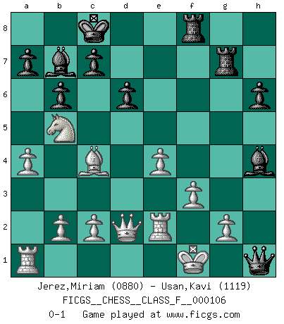 Last move : 0-1 2012 March 29 8:11:22 [Event "FICGS__CHESS__CLASS_F__000106"] [Site "FICGS"] [Date "2012.02.14"] [Round "1"] [White "Jerez,Miriam"] [Black "Usan,Kavi"] [Result "0-1"] [WhiteElo "0880"] [BlackElo "1119"] 1.e4 e5 2.Nf3 Nc6 3.d4 exd4 4.Nxd4 Nxd4 5.Qxd4 b6 6.Nc3 Bb7 7.Bc4 d6 8.O-O Nf6 9.Bf4 Qd7 10.h3 O-O-O 11.Rfe1 h6 12.a4 g5 13.Qxf6 Be7 14.Qxf7 gxf4 15.Qxf4 Rdf8 16.Qd2 Bh4 17.Nb5 Rh7 18.Re2 Rg7 19.f3 Qxh3 20.Kf1 Qh1+ 0-1 Scotch game Kingside Castling by player White (move 8) Queenside Castling by player Black (move 10) Player Black won this chess game. Follow this game move after move (download)I know people who have all the will in the world, but still can't play good Chess. (Bobby Fischer) Ich war zu klein für die Schach-Schülermannschaft! (Woody Allen) Yo creo que el Ajedrez posee una magia que es también una ayuda en la edad avanzada. Una rodilla reumática es olvidada durante una partida de Ajedrez y otros eventos pueden parecer algo sin importancia comparada a una catástrofe en el tablero de Ajedrez. (Vlastimil Hort) Votre prénom est 'Tactique', votre deuxième prénom est 'Tactique' et votre nom est 'Tactique'. (Ken Smith) Creativity is allowing yourself to make mistakes. Art is knowing which ones to keep. (Scott Adams)