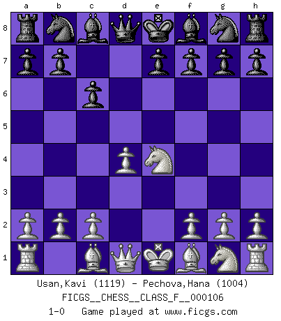 Last move : 1-0 2012 May 2 12:45:42 [Event "FICGS__CHESS__CLASS_F__000106"] [Site "FICGS"] [Date "2012.02.14"] [Round "1"] [White "Usan,Kavi"] [Black "Pechova,Hana"] [Result "1-0"] [WhiteElo "1119"] [BlackElo "1004"] 1.e4 c6 2.d4 d5 3.Nc3 dxe4 4.Nxe4 1-0 This chess game has been lost on time (started : 2012.02.14 5:56:41) Caro-Kann defense Player White won this chess game. Follow this game move after move (download)Pawn endings are to Chess what putting is to golf. (Cecil Purdy) Wenn es im Universum noch irgendwo intelligente Lebewesen gibt, dann kennen sie Go. (Emanuel Lasker) Aunque la mayoría de la gente disfruta observar las partidas de los grandes Maestros de ataque, algunos de los jugadores mas notables en la historia han sido los jugadores silenciosos posicionales. Lentamente ellos te aplastan despojandote de tu espacio, congestionando tus piezas y dejandote virtualmente sin nada que hacer. (Yasser Seirawan) Il n'y a plus de joueurs du niveau de Jacob Murray dont la seule quête est le beau jeu, le plaisir de voir les pièces construire quelque chose. Sur 10 idées à la minute, 9 seront sans intérêt, la dernière s'avèrera géniale. (Christian Bauer) Big Chess is a place for big hallucinations. (Thibault de Vassal)