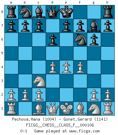Last move : 0-1 2012 May 2 12:45:42 [Event "FICGS__CHESS__CLASS_F__000106"] [Site "FICGS"] [Date "2012.02.14"] [Round "1"] [White "Pechova,Hana"] [Black "Gonet,Gerard"] [Result "0-1"] [WhiteElo "1004"] [BlackElo "1141"] 1.e4 d6 2.d4 Nf6 3.Nc3 g6 4.f4 Bg7 0-1 This chess game has been lost on time (started : 2012.02.14 5:56:41) Pirc : Austrian attack Player Black won this chess game. Follow this game move after move (download)When asked, -How is that you pick better moves than your opponents?, I responded: I'm very glad you asked me that, because, as it happens, there is a very simple answer. I think up my own moves, and I make my opponent think up his. (Alexander Alekhine) Der Umstand, daß uns eine 7 Stunden Zeitkontrolle ermöglicht eine großartige, tiefe Partie zu spielen, ist für die Massenmedien nicht weiter von Bedeutung. (Alexej Shirov) La captura del Rey enemigo es la finalidad pero no el primer objetivo de la partida. (William Steinitz) A ce moment-là, je menaçais de comprendre la position ! (Clément L'Heureux) If you lose the game you should win the analysis! (Proverb)