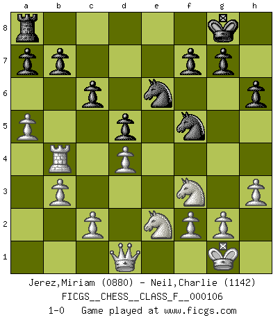Last move : 1-0 2012 April 3 18:35:48 [Event "FICGS__CHESS__CLASS_F__000106"] [Site "FICGS"] [Date "2012.02.14"] [Round "1"] [White "Jerez,Miriam"] [Black "Neil,Charlie"] [Result "1-0"] [WhiteElo "0880"] [BlackElo "1142"] 1.e4 e6 2.Nf3 d5 3.exd5 exd5 4.b3 Bd6 5.Nc3 c6 6.d4 Ne7 7.Bd3 O-O 8.O-O Nd7 9.Re1 Re8 10.h3 Nf8 11.a4 Bb4 12.Bd2 Bf5 13.Bxf5 Nxf5 14.Rxe8 Qxe8 15.a5 Ne6 16.Ne2 Qe7 17.Bxb4 Qxb4 18.Ra4 h6 19.Rxb4 1-0 French defense Kingside Castling by player Black (move 7) Kingside Castling by player White (move 8) Player White won this chess game. Follow this game move after move (download)You know, comrade Pachman, I don't enjoy being a Minister, I would rather play Chess like you. (Che Guevara) Schach ist ein Teil der Kultur, und wenn es mit der Kultur abwärts geht, geht es auch mit dem Schach abwärts. (Mikhail Moiseyevich Botvinik) El Ajedrez moderno está demasiado preocupado con cosas como la estructura de Peones. Olvidenlo, el Jaque Mate termina la partida. (Nigel Short) Que feriez-vous si vous étiez en train de jouer aux échecs et que la fin du monde arrive ? Je continuerais à jouer. (Saint Borromée) Do not put your faith in what statistics say until you have carefully considered what they do not say. (William W. Watt)
