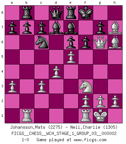Last move : 1-0 2007 February 12 15:35:50 [Event "FICGS__CHESS__WCH_STAGE_1_GROUP_03__000002"] [Site "FICGS"] [Date "2007.01.16"] [Round "1"] [White "Johansson,Mats"] [Black "Neil,Charlie"] [Result "1-0"] [WhiteElo "2275"] [BlackElo "1305"] 1.d4 Nf6 2.c4 Nc6 3.Nf3 e6 4.a3 d6 5.Nc3 d5 6.cxd5 Nxd5 7.e4 Nxc3 8.bxc3 Be7 9.Bd3 O-O 10.O-O Bd7 11.Rb1 Rb8 12.Qc2 Re8 13.e5 f6 14.Bxh7+ Kf7 15.Qg6+ Kf8 16.Bh6 1-0 Kevitz-Trajkovich defense Kingside Castling by player Black (move 9) Kingside Castling by player White (move 10) Player White won this chess game. Follow this game move after move (download)If Chess is a science, it's a most inexact one. If Chess is an art, it is too exacting to be seen as one. If Chess is a sport, it's too esoteric. If Chess is a game, it's too demanding to be just a game. If Chess is a mistress, she's a demanding one. If Chess is a passion, it's a rewarding one. If Chess is life, it's a sad one. (Unknown) Der Vorposten provoziert a) eine Basis für neue Angriffe und b) eine Schwächung der gegnerischen Widerstandskraft in der fraglichen Linie. (Aaron Nimzowitsch) Los Peones son el alma de una partida de Ajedrez. (Francois Andre Danican Philidor) Avant la finale, les dieux ont créé le milieu de partie. (Tarrasch) A good book on your shelf is a friend that turns its back on you and remains a friend. (Author unknown)