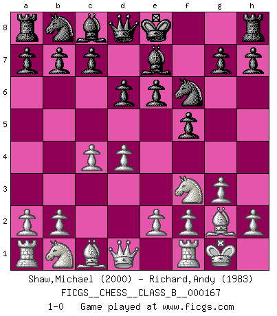 Last move : 1-0 2012 March 27 10:36:46 [Event "FICGS__CHESS__CLASS_B__000167"] [Site "FICGS"] [Date "2012.02.15"] [Round "1"] [White "Shaw,Michael"] [Black "Richard,Andy"] [Result "1-0"] [WhiteElo "2000"] [BlackElo "1983"] 1.Nf3 f5 2.d4 Nf6 3.g3 e6 4.Bg2 Be7 5.c4 d6 6.O-O 1-0 This chess game has been lost on time (started : 2012.02.15 15:16:18) Reti v Dutch Kingside Castling by player White (move 6) Player White won this chess game. Follow this game move after move (download)The game of Chess is not merely an idle amusement; several very valuable qualities of the mind are to be acquired and strengthened by it, so as to become habits ready on all occasions; for life is a kind of Chess. (Benjamin Franklin) Ich bin stolz ein Bulgare zu sein. (Veselin Topalov) Vive, pierde y aprende al observar a tu oponente como gana. (Amber Steenbock) Psychologiquement, tu dois avoir confiance en toi même, mais cette confiance doit être basée sur des faits. (Robert Fischer) You have to believe in yourself. (Sun Tzu)